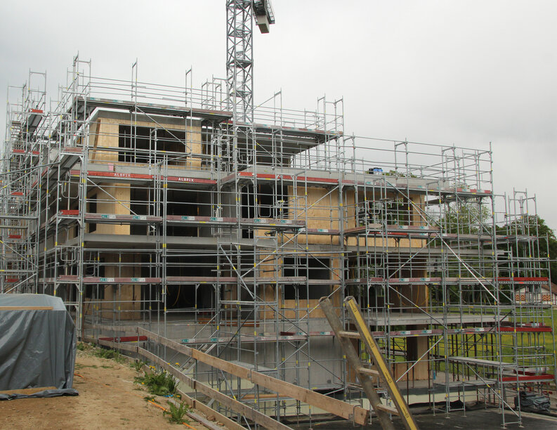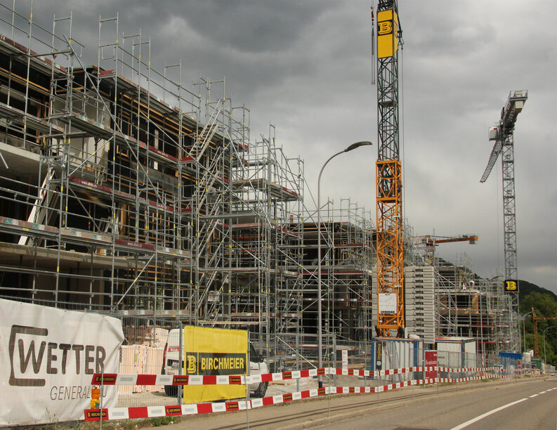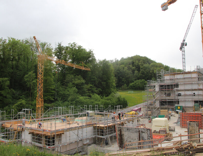 Der Rohbau der 37 neuen Wohneinheiten steht. Während am letzten Gebäude noch betoniert wird, warten die ersten beiden Häuser bereits auf die abschliessende Fassade. Der endgültige Look kann dank dem extra angefertigten Fassaden-Musterelement (siehe Fotos) bereits erahnt werden.