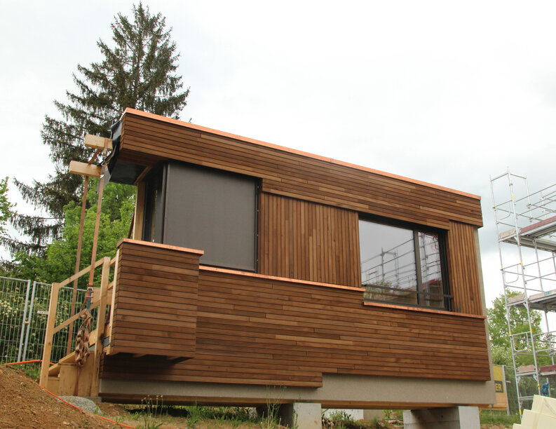 Sprichwörtlich hinter der Fassade weisen die Aussenwände einen innovativen Aufbau auf. Die tragenden, teilweise sichtbaren Brettsperrholzwände und die Betonaussenwände werden aussen von vorgehängten Holzrahmen-Elementen überdeckt, womit eine Flächendeckende Dämmschicht erreicht wird. Innen gibt es eine zusätzliche Dämmschicht im Installationsrost. Die abschliessende innere Beplankung besteht aus einer Gipsfaserplatte.