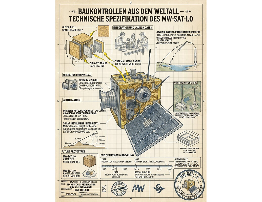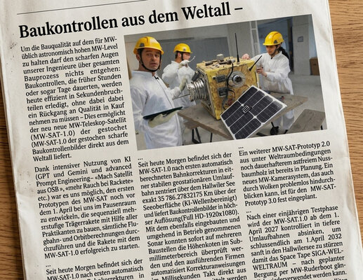 Dank intensiver KI-Nutzung war es uns möglich, den ersten Prototypen des MW-SAT noch vor dem 1. April bei uns im Pausenraum zu entwickeln, die sequenziell mehrstufige Trägerrakete mit Hilfe aller Praktikanten zu bauen, sämtliche Flugbahn- und Orbit Berechnungen durchzuführen und die Rakete mit dem MW-SAT-1.0 erfolgreich zu starten.
