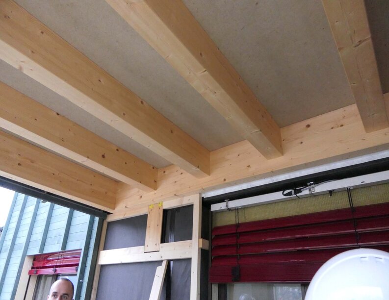 In den Wohnungen wurden sichtbare Brettstapeldecken realisiert. Die Haupttragstruktur bilden Unterzüge und Stützen. Die Lastabtragung verläuft konsequent über alle Geschosse durch. Die Aussteifung erfolgt über die Treppenhauskerne und den Einsatz von Deckenscheiben mit OSB-Platten.