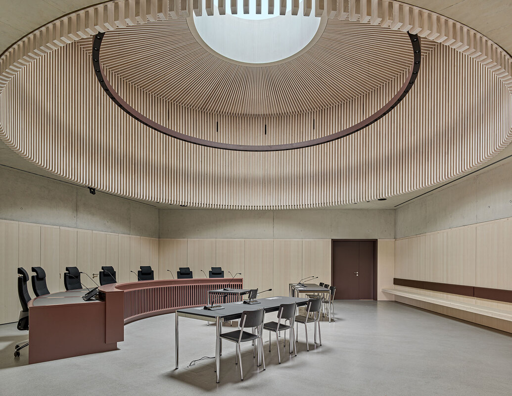 Das moderne Gerichtsgebäude besteht aus zwei Untergeschossen für Technikräume und Abstellplätze für Motorfahrzeuge, sowie drei Obergeschossen für Gerichtssäle, Vorbereitungsräume und Büros. Das Herzstück der Anlage bildet der zweigeschossige grosse Gerichtssaal im Zentrum des Gebäudes. Die um den Kern liegenden Verhandlungs- und Büroräume inkl. Korridor sind in Holzbauweise realisiert. Im dritten Obergeschoss wurde eine Bibliothek und verschiedene speziell schallgedämmte Räume konzipiert. Eine optionale spätere Aufstockung ist möglich. Das Gebäude wurde freiwillig mit einer Brandmeldevollüberwachung ausgestattet.