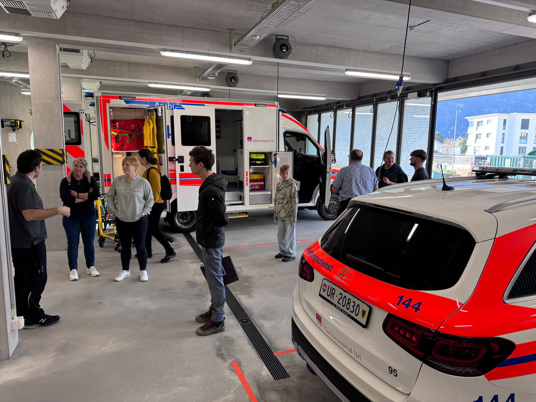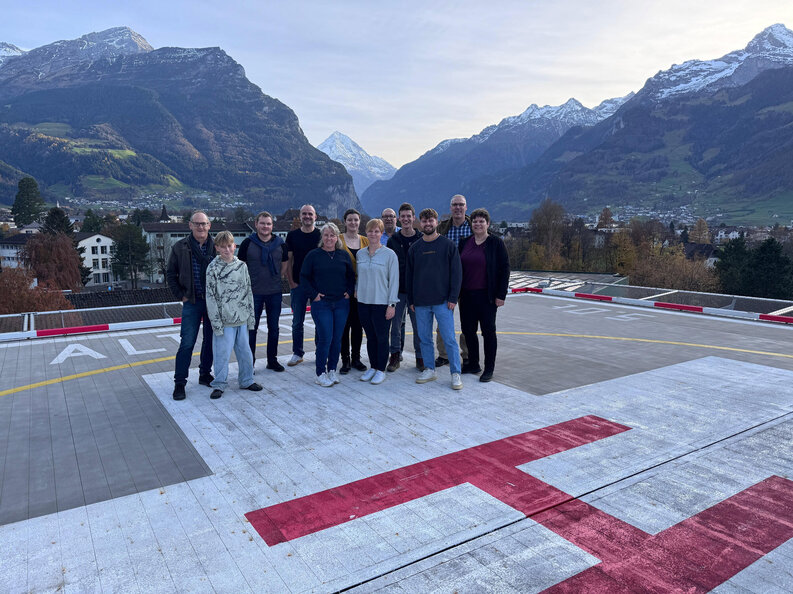 Am Nachmittag stand das Kantonsspital Uri in Altdorf auf dem Programm, bei welchem wir den Neubau und diverse Umbauten brandschutztechnisch begleiten durften. Unser Rundgang begann im Neubau mit der Besichtigung der Rettungsdiensthalle und der Cafeteria. Anschliessend konnten wir die eindrucksvolle Technikzentrale im Untergeschoss bestaunen. Durch die unterirdischen Verbindungsgänge gelangten wir in die benachbarten Gebäude, wo wir unter anderem die umgebauten Bürogeschosse besichtigen durften. Zurück im Neubau konnten wir die Umsetzung der horizontalen Evakuierung in den Bettengeschosse besichtigen. Den Abschluss bildeten die Technikräume und der Helikopterlandeplatz auf dem Dach.