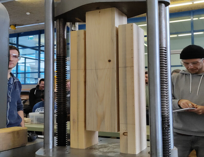 Benjamin Wey und Adrian Riedweg haben mit der aktuellen Bauführerklasse Holzbau verschiedene Verbindungen getestet. An der schweizerischen Bauschule in Aarau wurden Verbindungen mit Schrauben, Dübeln, Bauschrauben etc. dimensioniert, hergestellt und anschliessend in Bruchversuchen getestet.
