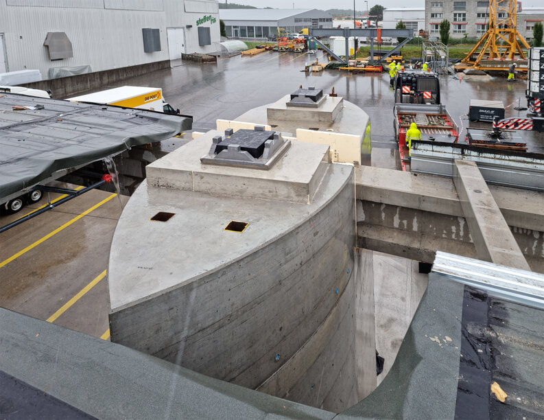 Die Montage des Stahl-Fachwerkes, welches als Mittelauflager für die 4 "Holzbrücken" dient, wurde passgenau gesetzt. Am selben Tag wurde Element 1 gehoben. Dies führte planmässig zu einem statischen Ungleichgewicht, weshalb das Stahlfachwerk temporär verankert und gesichert werden musste. Dafür wurden bereits vorgängig Betoneinlagen geplant. Am darauffolgenden Tag konnte Element 2 gehoben werden. Aufgrund der sehr geringen Montage-Toleranzen betreffend Auflagerausbildung (+/- 2mm) und der Setzung bis 4cm an den Bestand, sowie der beachtlichen Abmessungen und Gewichte der Elemente (siehe Newseintrag Aufrichte) war diese erste Montage-Etappe eine grosse Challenge. Zudem musste der Betrieb der darunterliegenden Spedition aufrechterhalten werden und den Regengüssen standgehalten werden. Dank der Profis auf der Baustelle, sowie im Kran lief alles reibungslos und millimetergenau ab. Deshalb möchten wir an dieser Stelle ein grosses Kompliment und Dankeschön an die Montagetruppe der Zaugg AG aussprechen.