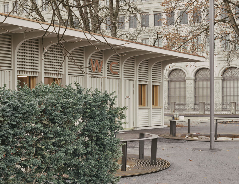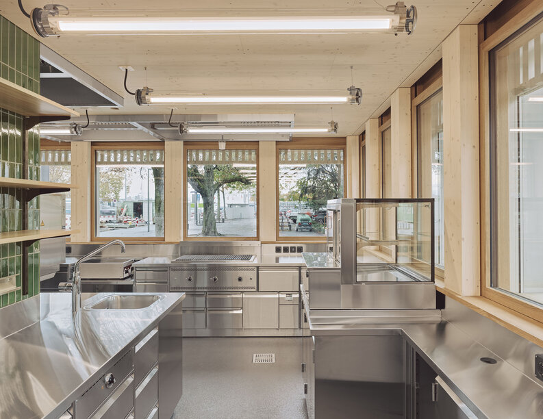 Das eingeschossige Gebäude mit Untergeschoss beherbergt neben der Gastronomiefläche zwei Schalter der Marktpolizei, zwei Züri-WCs, Gäste-WCs sowie Haustechnik und eine Trafoanlage. Das Untergeschoss wurde in konventioneller Massivbauweise mit Holz-Innenwänden realisiert. Das Erdgeschoss und das Flachdach wurden als Holzkonstruktion erstellt. Das Vordach wurde so konzipiert, dass es von den auskragenden Fassadenstützen getragen wird. Die Fassadenbekleidung zwischen den Fassadenstützen besteht aus einer horizontalen Holzlattung im Brüstungs- und Sturzbereich und einer vertikalen Holzlattung vor der Fensterebene. Die Fassade wurde mit einem deckenden, diffusionsoffenen Anstrich geschützt. Um spätere Austauscharbeiten und/oder Rückbauten zu ermöglichen, wurde auf die Trennbarkeit der jeweiligen Bauteile geachtet.
