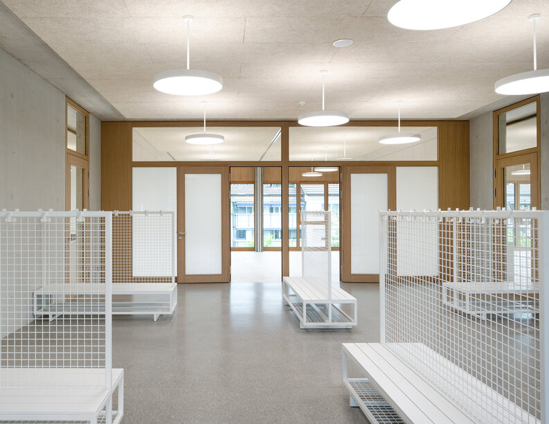 Mit Freude verkünden wir die baldige Fertigstellung des neuen Schulhauses Steinwies in Schwerzenbach. Dieses moderne Gebäude besticht durch seine klare Architektur und die durchdachte Raumgestaltung. Schon bei der Ankunft fällt der Blick auf die elegante Wendeltreppe, die durch das prominente Oberlicht aus Glasbausteinen ein interessantes Lichtspiel bietet. Diese Treppe bildet eines der Designelemente des Gebäudes und verleiht ihm seinen einzigartigen Charakter. Im Inneren erwarten die Schülerinnen und Schüler helle und freundliche Räume. Die grosszügigen Klassenzimmer sind mit warmen Holzoberflächen ausgestattet und schaffen eine angenehme Lernatmosphäre. Die sorgfältig geplanten Details laden dazu ein, im Gebäude zu verweilen und dies zu erkunden.