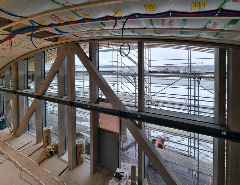 Die Montageetappen sind inklusive Wintergarten-Anbau abgeschlossen. Aussen, sowie innen sind die Ausbauabreiten in vollem Gange. Dazu gehören auch die Abschlüsse zu der bestehenden Halle. Pünktlich zum Jahresabschluss wurde der Durchbruch zum Bestand gemacht, womit sich das Endergebnis bereits erahnen lässt. Von aussen lässt sich bereits fast nicht mehr erkennen, dass die vier Holzbrücken, in welchen die neuen Büroräumlichkeiten angeordnet sind nicht seit jeher die Spedition überspannen und kein Teil des Bestandes sind. Wir wünschen allen Beteiligten einen guten Endspurt und eine erholsame Zeit in den verdienten Weihnachtsferien.