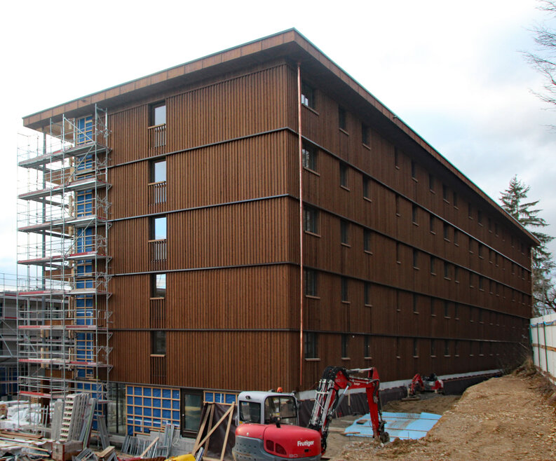 Auf dem alten Cheddite-Areal ist die Wohnüberbauung Weidmatt fertig aufgerichtet. Die Fassadenschalung mit den gut erkennbaren Brandschutzschürzen ist an zwei Gebäuden so gut wie fertig montiert. Von der Durchfahrtsstrasse her wo das Gerüst entfernt wurde, kann die fertige Fassade schon beäugt werden. Auch im Innenausbau schreiten die Arbeiten schnell voran. So sind die Wohnungen in zwei Gebäuden bereits fertiggestellt und in einem Gebäude sogar bald bezugsbereit.
