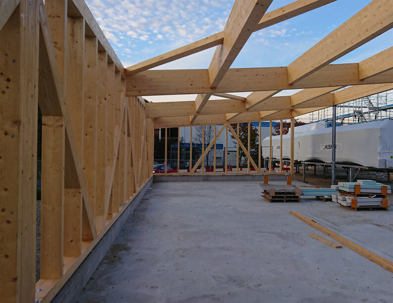 Der Bau besteht aus zwei Gebäuden, dem Werkhof und einem freistehend einseitig offenen Unterstand für Anhänger. Bis auf die Fundation (Bodenplatte) und wenige Betonwände beim Waschplatz wird die gesamte Kontruktion der ein bis zwei Geschosse des Werkhofs und der gesamte Unterstand in Holzbauweise erstellt. Die Holzkonstruktion für den Unterstand ist bereits aufgerichtet, und der Werkhof nimmt ebenfalls Gestalt an.