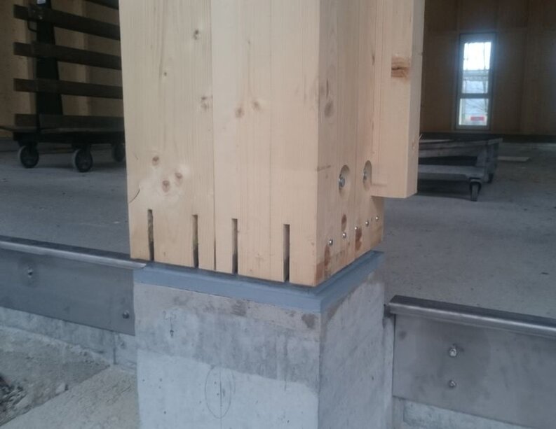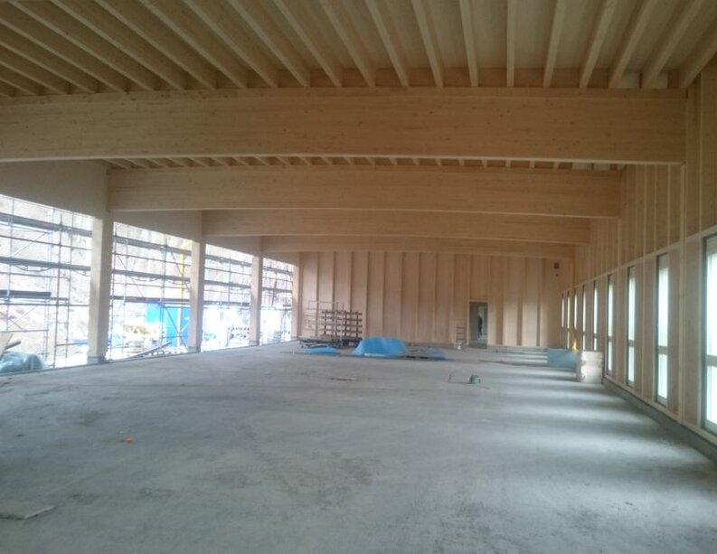 Die Tragkonstruktion der Halle 1 besteht aus Primärträger aus Brettschichtholz, welche in einem Raster von 6.10m angeordnet sind. Die Träger sind ohne Mittelstützen von Aussenwand zu Aussenwand frei tragend. Zwischen die Träger wird das Sekundärtragwerk eingehängt. Die Aussteifung der Konstruktion erfolgt über die vollflächige Dachscheibe, von welcher die Wind- Erdbebenlasten über Aussteifungskreuze in Stahl oder Wandscheiben in die Fundamente eingeleitet werden.Die Aussenwände werden je nach Bedarf mehr oder weniger stark ausgedämmt. Der Zwischenboden wird aus Hohlkastenelementen ausgebildet. Die gerechnete Nutzlast beträgt 500kg/m2.