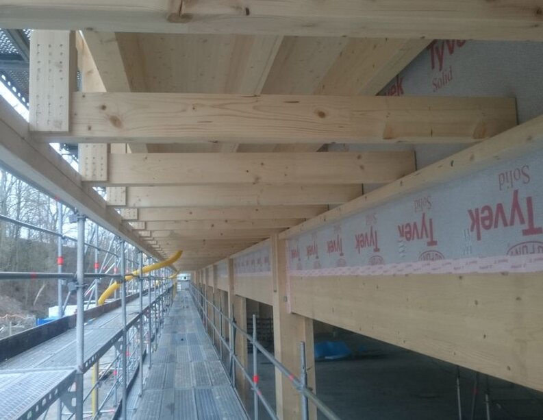 Nachdem im Herbst das 3-geschossige Betriebsgebäude aufgestellt wurde, ist nun im Januar die Halle 1 aufgerichtet worden.