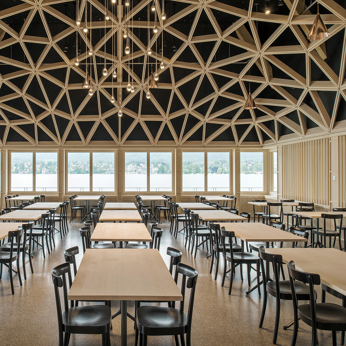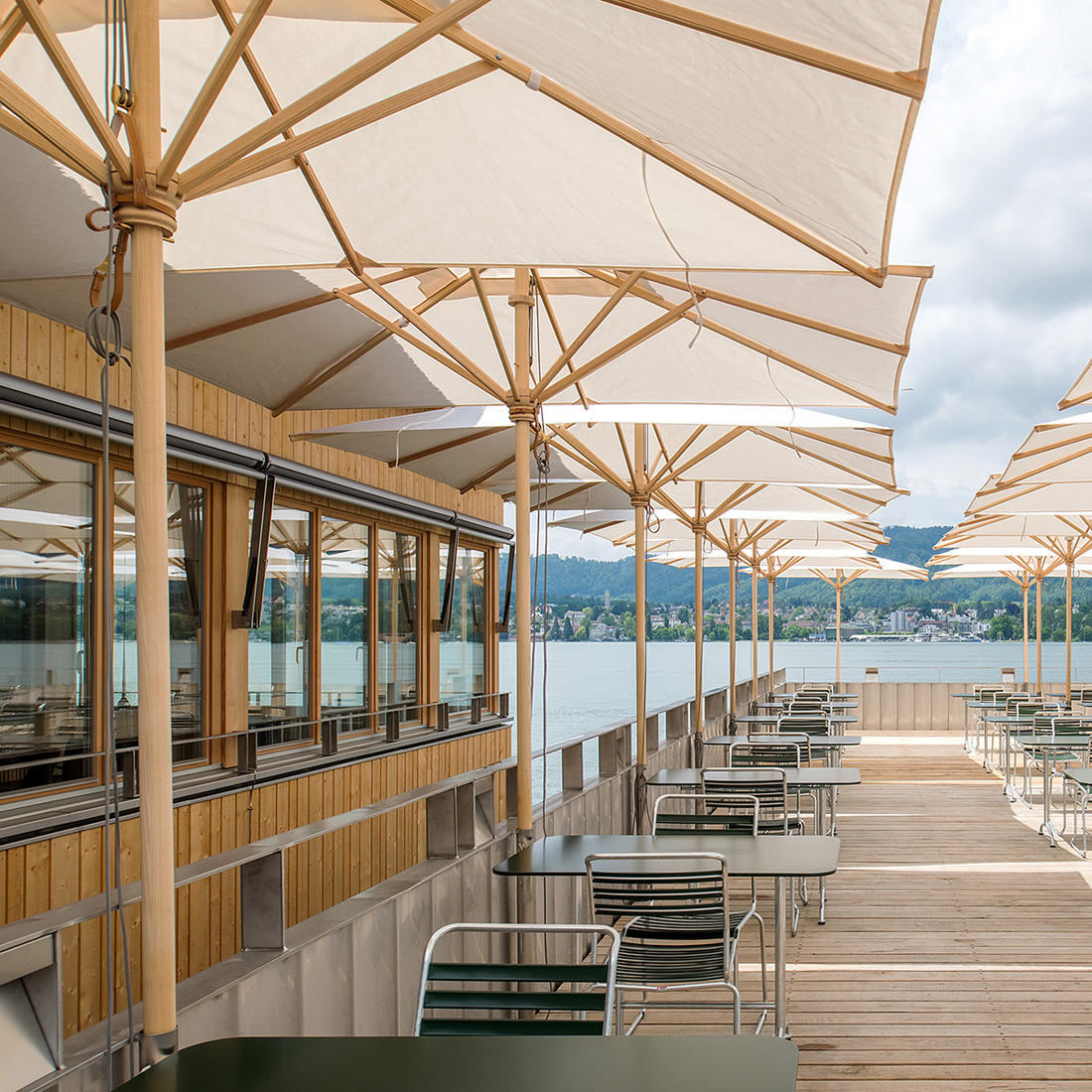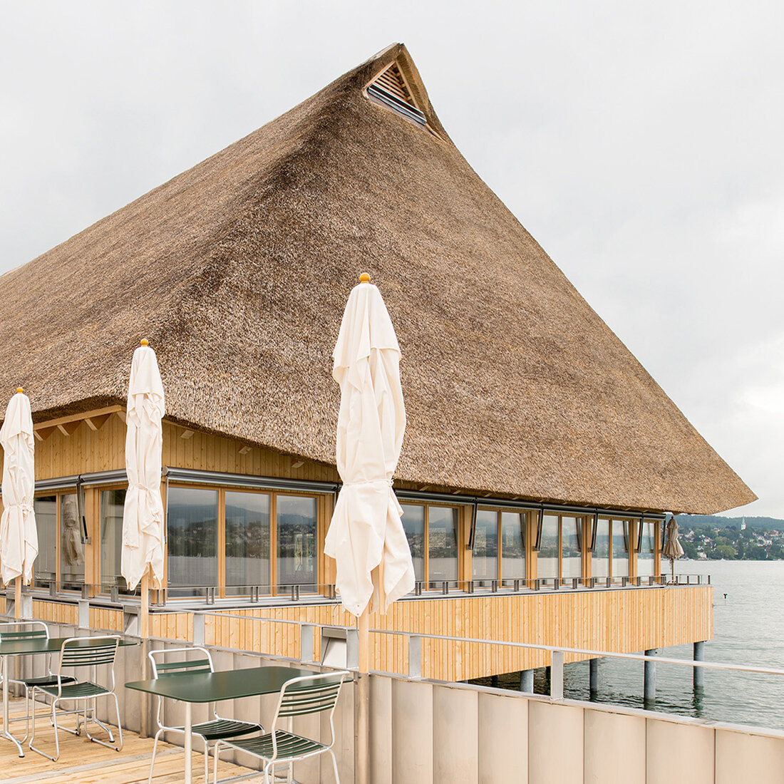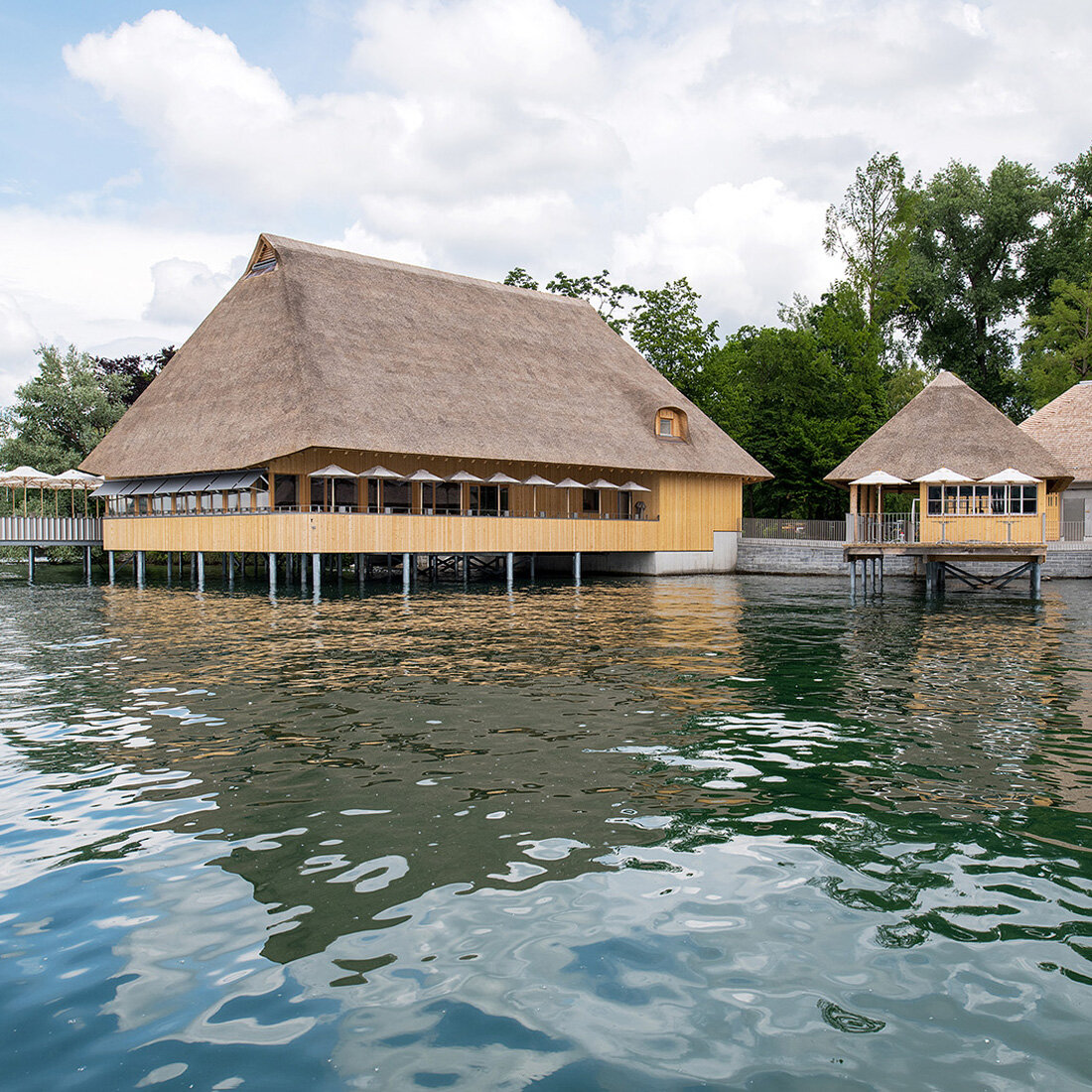 Das Restaurant Fischerstube prägt als Landmark die Parklandschaft am Zürichhorn. Die denkmalgeschützten Bauten bilden ein Ensemble von grossen, mit Schilf und Holzschindeln gedeckten Dächern inmitten gros-ser Bäume. Der Ersatzneubau des Restaurant Fischerstube zeigt, wie ein Neubau des historisch bedeutsamen Pfahlbaus in moderner Architektur realisiert werden kann.