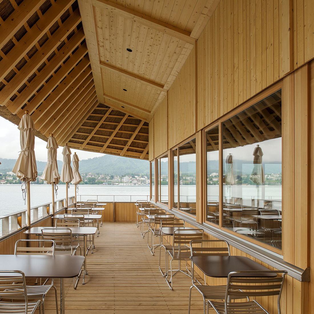 Es handelt sich um eine neue Interpretation des abgebrannten Original-bauwerks von 1939. Holz wird vielfältig eingesetzt: als Mischbauweise bei der Fischerstube, im Innenausbau und bei der restaurierten Fischer-hütte. Das Gartenbuffet hat ein Dach aus Holzelementen und eine Fas-sade aus feingliedrigen Stäben. Aus bauphysikalischen Gründen konnte unter dem Schilfdach direkt keine hohlraumfreie, nicht brennbare Brand-schutzplatte montiert werden. Somit verringert die Trennung des grossen Dachraumes (Schilfdach) gegen die genutzten Räume (Gastraum, Kü-che und Garderoben)  mit Feuerwiderstand von 30 Minuten ein mögli-ches Schadenausmass im Brandfall.