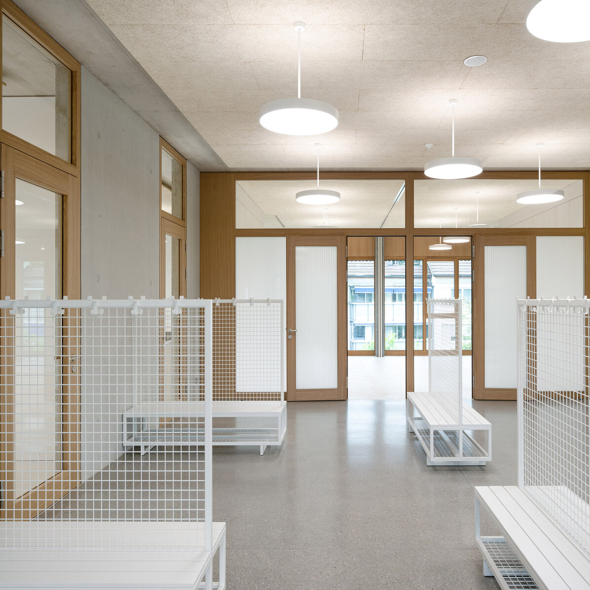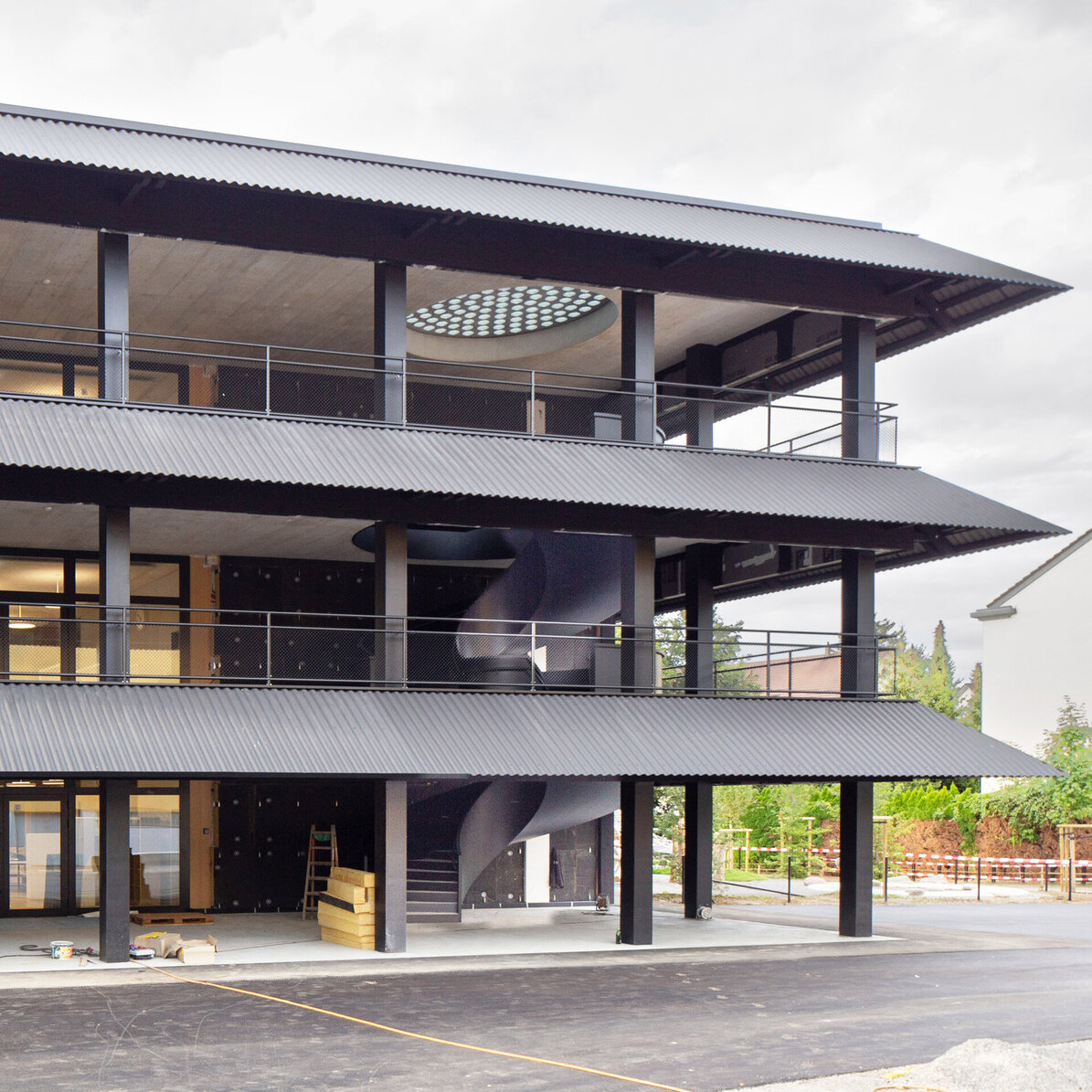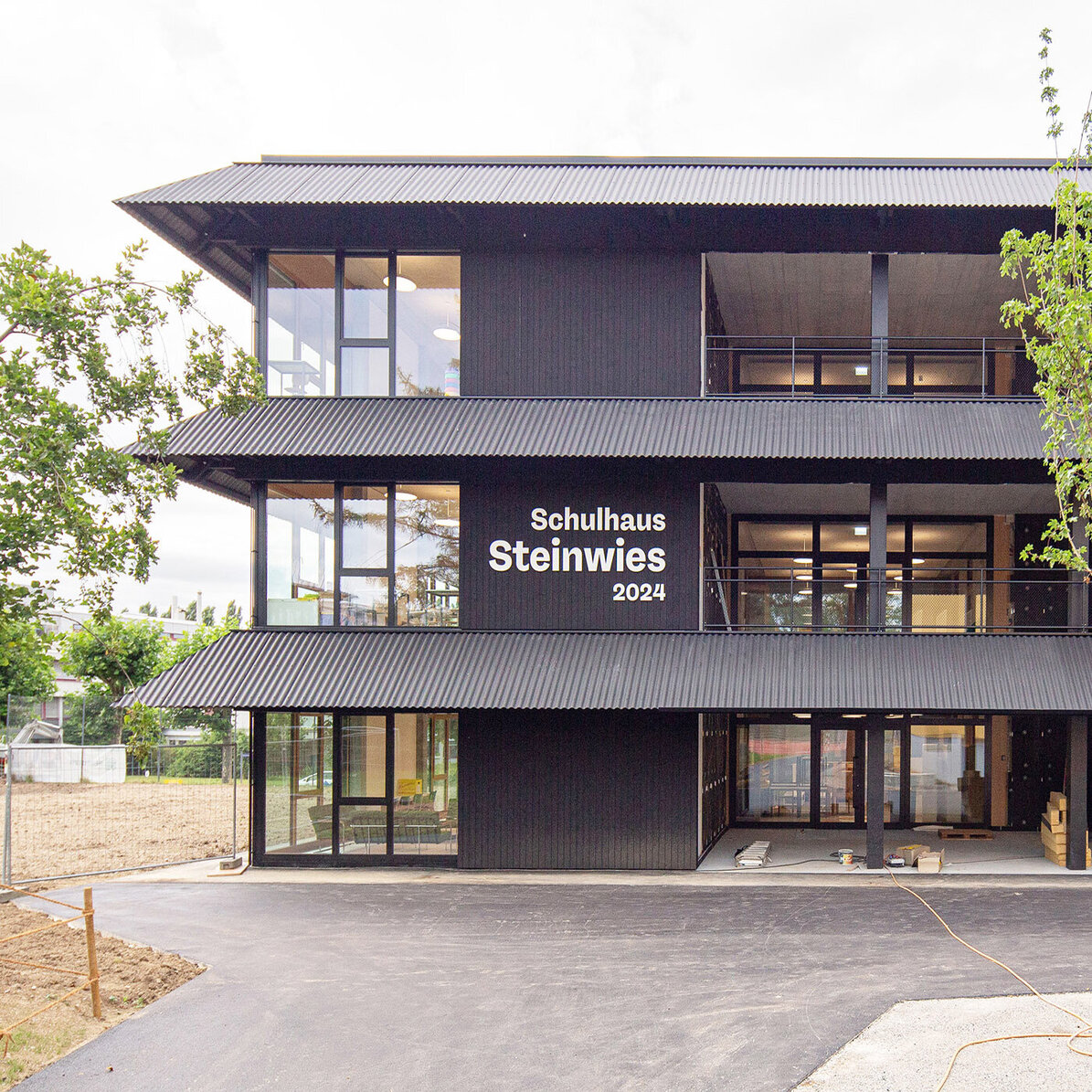 Das Schulhaus Schwerzenbach ist als Hybridbau konzipiert und kombiniert eine massive Tragstruktur mit präzise ausgeführten Holzaussenwänden. Das quadratische, dreigeschossige Volumen kann bei Bedarf um ein weiteres Geschoss aufgestockt werden und reagiert so flexibel auf künftige Anforderungen. Der südseitige Zugang führt über eine gedeckte Vorzone, die zugleich Erschliessung mittels einer grosszügigen aussenliegenden Wendeltreppe aus Stahl, Aussenklassen-zimmer und Pausenraum für die Primarschüler ist. Im Innern werden die Klassenzimmer mit Gruppenräumen, die Kindergartenräume und das Lehrerzimmer über einen grosszügigen Garderobenbereich erschlossen. Das Gebäude mittlerer Höhe folgt einem baulichen Brandschutzkonzept und kommt mit minimaler Technik aus. Auf eine Lüftungs- oder Klimaanlage wurde bewusst verzichtet, da eine Querlüftung über Fensterflügel in jedem Klassenzimmer möglich ist. Die weit auskragenden Vordächer aus zementgebundenen Wellplatten dienen als Brise Soleil und reduzieren die Gebäudeerwärmung. Die schlichte schwarze Holzfassade verleiht dem Bau einen modernen, natürlichen Charakter. Innen schaffen helle Holzoberflächen Wärme, Wohlbefinden und ein lichtdurchflutetes Lernumfeld.