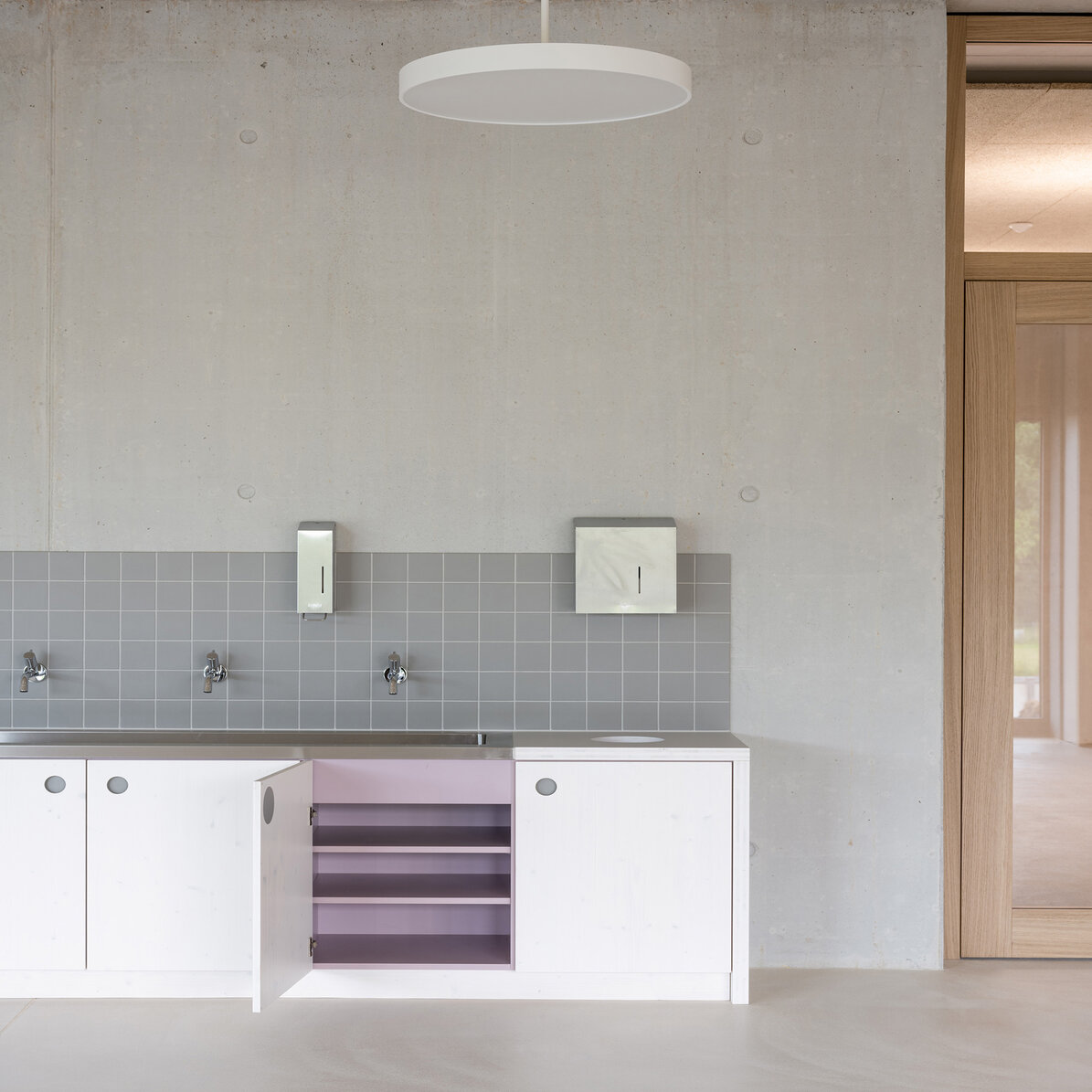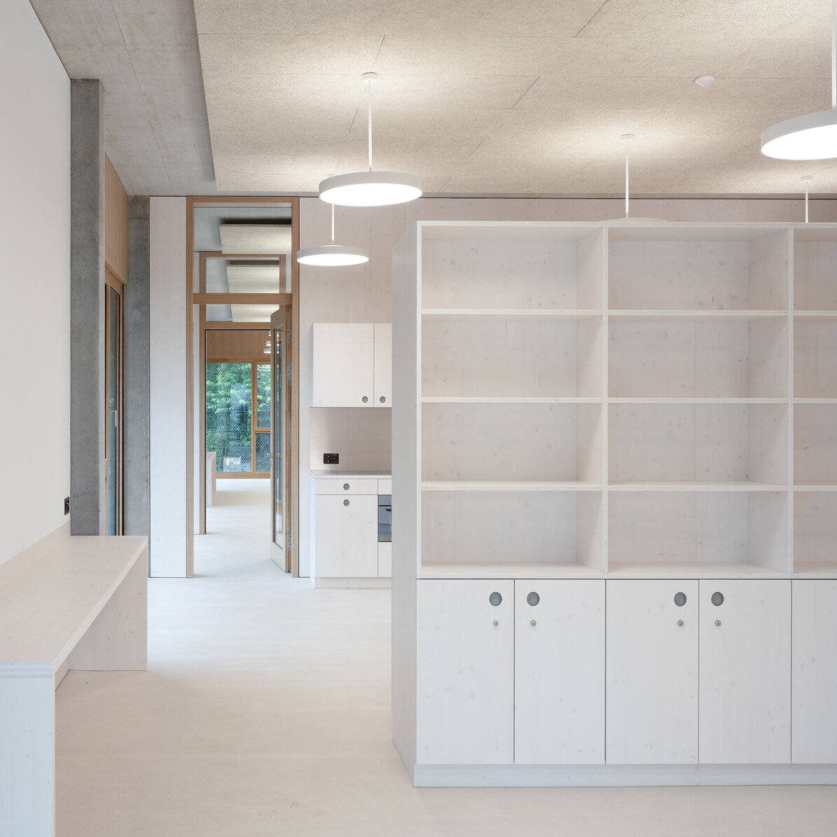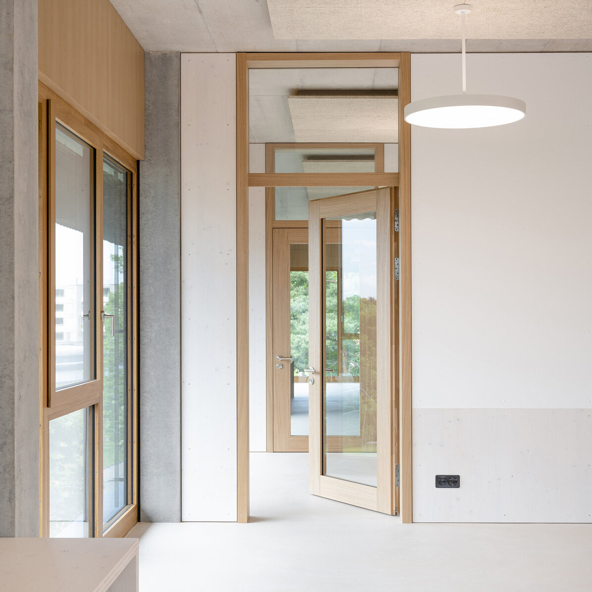 Das Schulhaus Schwerzenbach ist als Hybridbau konzipiert und kombiniert eine massive Tragstruktur mit präzise ausgeführten Holzaussenwänden. Das quadratische, dreigeschossige Volumen kann bei Bedarf um ein weiteres Geschoss aufgestockt werden und reagiert so flexibel auf künftige Anforderungen. Der südseitige Zugang führt über eine gedeckte Vorzone, die zugleich Erschliessung mittels einer grosszügigen aussenliegenden Wendeltreppe aus Stahl, Aussenklassen-zimmer und Pausenraum für die Primarschüler ist. Im Innern werden die Klassenzimmer mit Gruppenräumen, die Kindergartenräume und das Lehrerzimmer über einen grosszügigen Garderobenbereich erschlossen. Das Gebäude mittlerer Höhe folgt einem baulichen Brandschutzkonzept und kommt mit minimaler Technik aus. Auf eine Lüftungs- oder Klimaanlage wurde bewusst verzichtet, da eine Querlüftung über Fensterflügel in jedem Klassenzimmer möglich ist. Die weit auskragenden Vordächer aus zementgebundenen Wellplatten dienen als Brise Soleil und reduzieren die Gebäudeerwärmung. Die schlichte schwarze Holzfassade verleiht dem Bau einen modernen, natürlichen Charakter. Innen schaffen helle Holzoberflächen Wärme, Wohlbefinden und ein lichtdurchflutetes Lernumfeld.