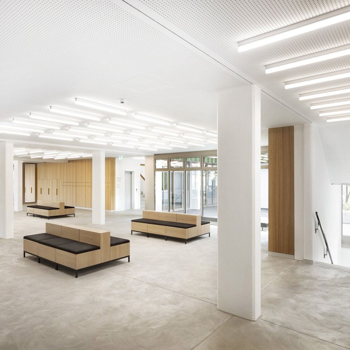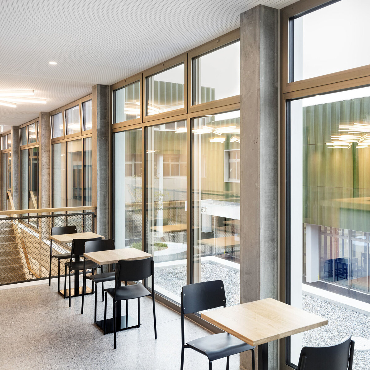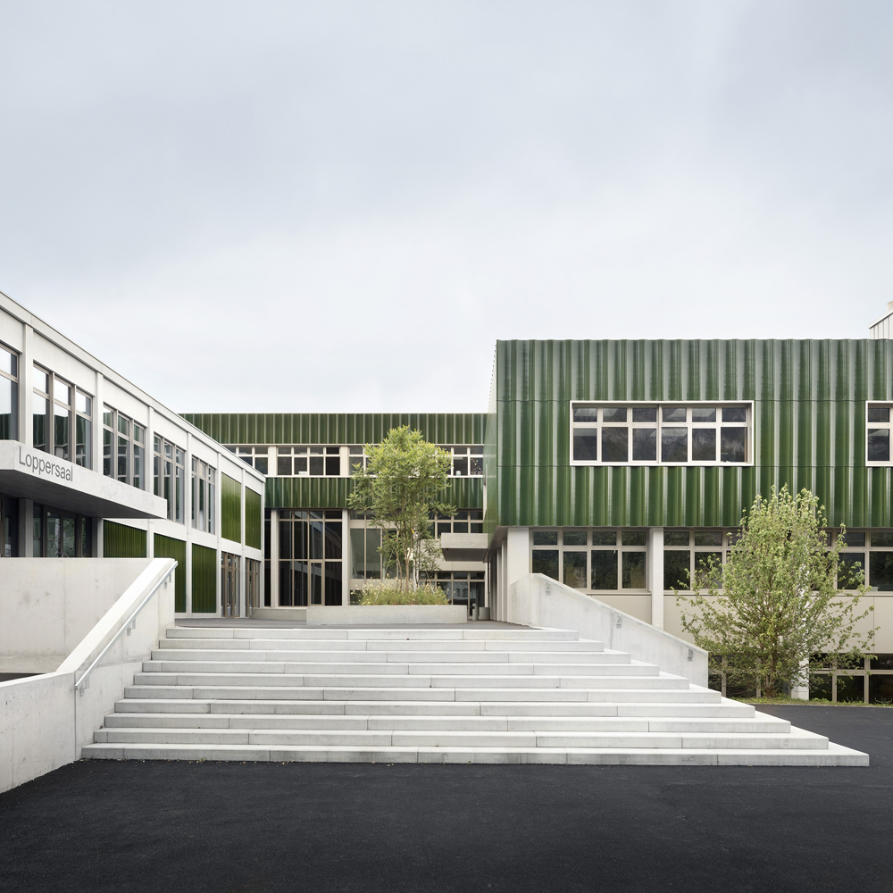 Die Schulanlage Grossmatt umfasst drei Geschosse über und zwei Geschosse unter Terrain. Mit einer Gesamthöhe unter 11 m gilt sie als «Gebäude gerin-ger Höhe». Die 1974 erstellte Anlage wurde umfas-send erneuert, um Struktur, Raumorganisation, Beleuchtung und insbesondere die Erdbebensicher-heit heutigen Anforderungen anzupassen. Der neu gestaltete Innenhof schafft eine klare Adressierung der Zugänge und verbessert die Abläufe; neue Ver-bindungen stärken die Funktionalität der Gesamtan-lage. Die grosszügigen Treppenhäuser können im Ereignisfall über brandfallgesteuerte Tore als sichere vertikale Fluchtwege genutzt werden. Eine Brand-meldeanlage Teilüberwachung erhöht die Betriebssi-cherheit. Loppersaal und Aula sind als "Räume mit grosser Personenbelegung" mit einem abgestimm-ten RWA-Konzept und einem sprachgesteuerten Informationssystem ausgestattet. Eine besondere Herausforderung war der durchgehende Betrieb des Loppersaals während der Bauzeit. Die Materialisie-rung orientiert sich an der ursprünglichen Architektur: Sichtbetonstützen, bronzefarbene Aluminiumfenster und eine grüne Keramikfassade prägen das Äussere, während die Innenräume moderne Oberflächen, verbesserte Akustik und eine funktionale Ausstattung erhielten.