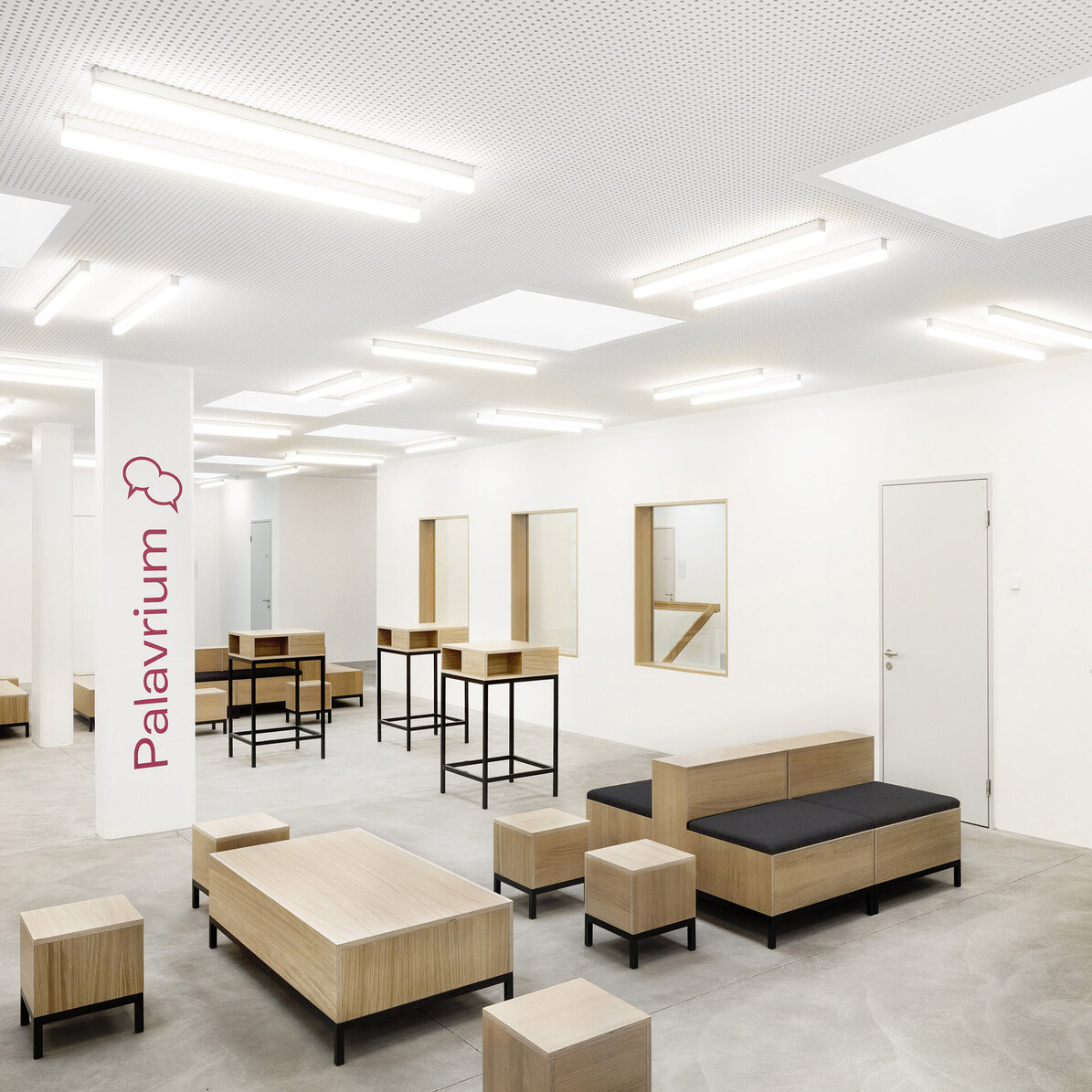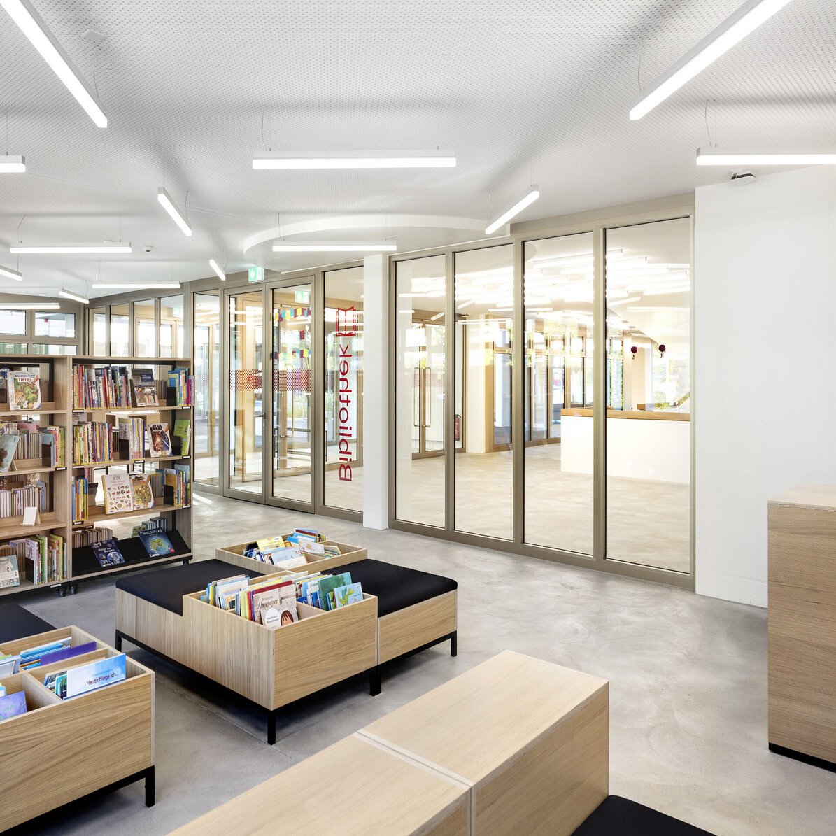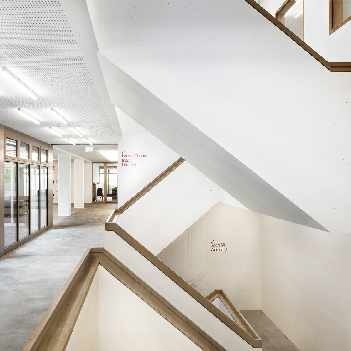 Die Schulanlage Grossmatt umfasst drei Geschosse über und zwei Geschosse unter Terrain. Mit einer Gesamthöhe unter 11 m gilt sie als «Gebäude gerin-ger Höhe». Die 1974 erstellte Anlage wurde umfas-send erneuert, um Struktur, Raumorganisation, Beleuchtung und insbesondere die Erdbebensicher-heit heutigen Anforderungen anzupassen. Der neu gestaltete Innenhof schafft eine klare Adressierung der Zugänge und verbessert die Abläufe; neue Ver-bindungen stärken die Funktionalität der Gesamtan-lage. Die grosszügigen Treppenhäuser können im Ereignisfall über brandfallgesteuerte Tore als sichere vertikale Fluchtwege genutzt werden. Eine Brand-meldeanlage Teilüberwachung erhöht die Betriebssi-cherheit. Loppersaal und Aula sind als "Räume mit grosser Personenbelegung" mit einem abgestimm-ten RWA-Konzept und einem sprachgesteuerten Informationssystem ausgestattet. Eine besondere Herausforderung war der durchgehende Betrieb des Loppersaals während der Bauzeit. Die Materialisie-rung orientiert sich an der ursprünglichen Architektur: Sichtbetonstützen, bronzefarbene Aluminiumfenster und eine grüne Keramikfassade prägen das Äussere, während die Innenräume moderne Oberflächen, verbesserte Akustik und eine funktionale Ausstattung erhielten.