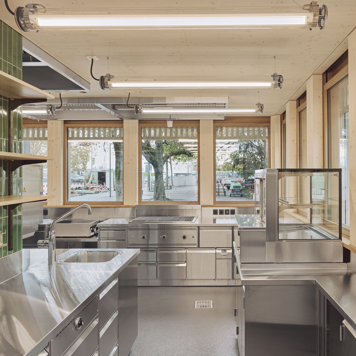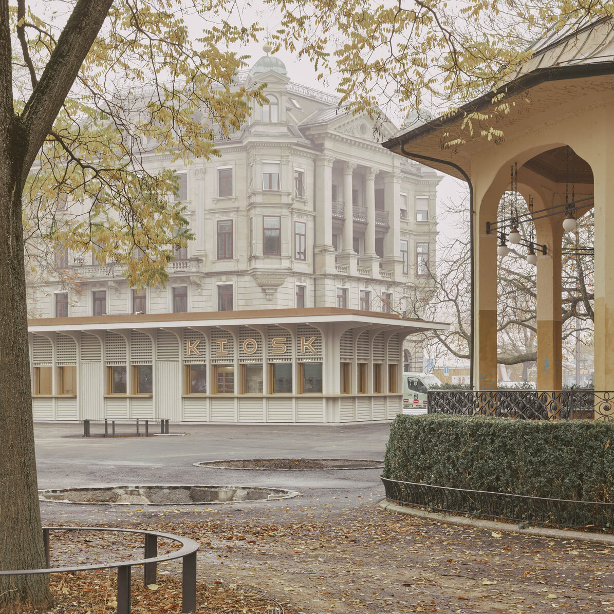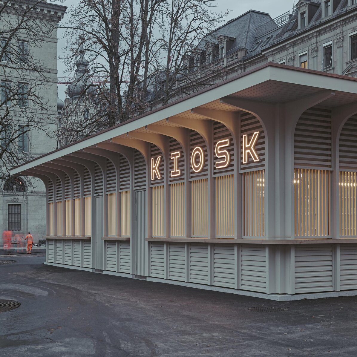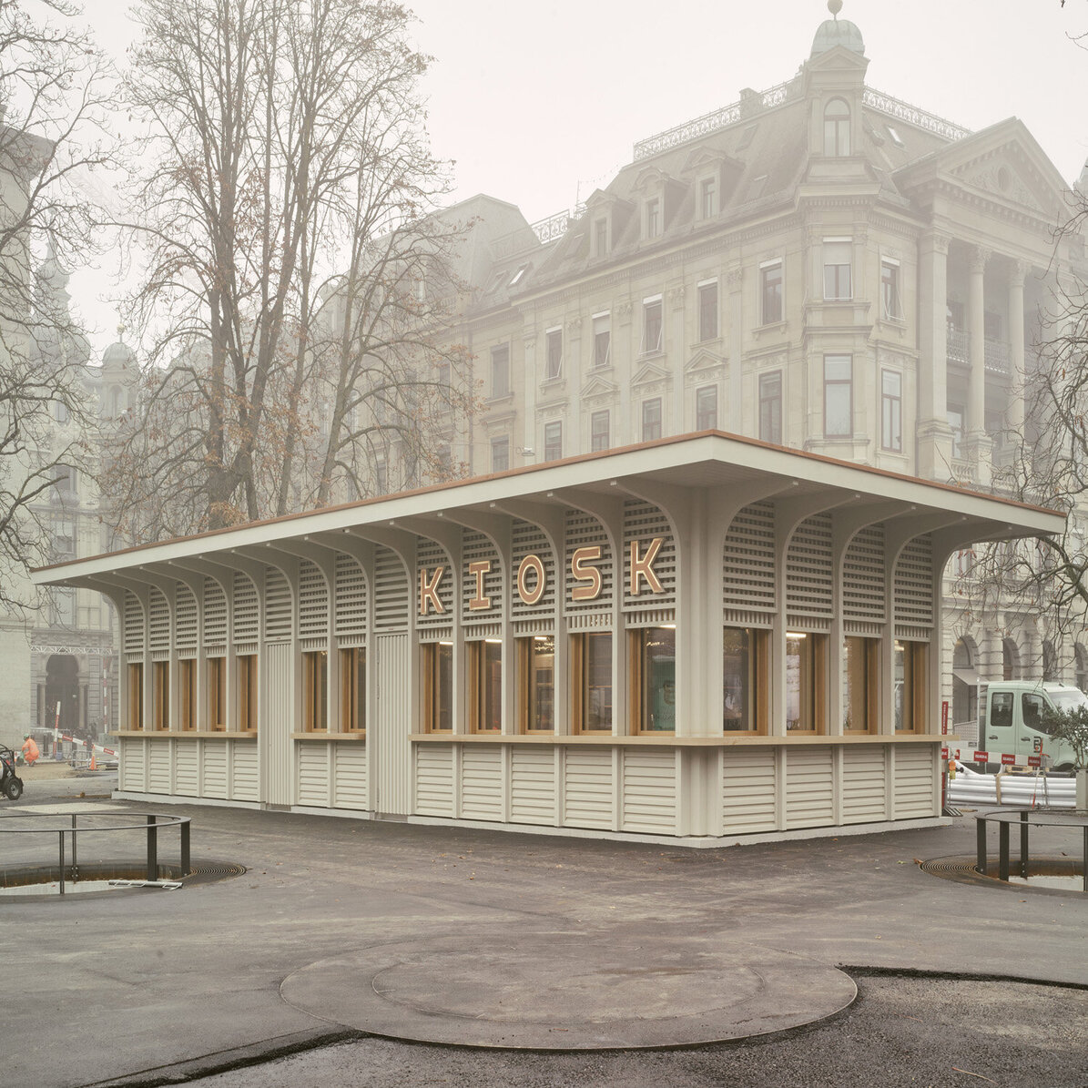 Der Kiosk wurde im Rahmen der Instandstellung der Stadthausanlage durch ein modernes Gebäude ersetzt. Der Neubau vereint verschiedene Nutzungen unter einem Dach. Der kompakte, eingeschossige Holzbau mit Untergeschoss enthält neben der Gast-ronomiefläche zwei Schalter der Marktpolizei, zwei Züri-WCs, Gäste-WCs sowie Haustechnik und eine Trafostation. Das Untergeschoss wurde in konventio-neller Massivbauweise mit Holz-Innenwänden reali-siert. Das Erdgeschoss und das Flachdach wurden als Holzbaukonstruktion erstellt. Die Holzkonstruktion liegt auf einem umlaufenden Sockel aus Sichtbeton auf. Das Vordach wurde so konzipiert, dass es von den auskragenden Fassadenstützen getragen wird. Die nicht tragenden Innenwände und die Aussen-wand wurde in Holzrahmenbauweise erstellt. Die Fassadenbekleidung zwischen den Fassadenstützen besteht aus einer horizontalen Holzlattung im Brüs-tungs- und Sturzbereich und einer vertikalen Holzlat-tung vor der Fensterebene. Die Fassade wurde mit einem deckenden, diffusionsoffenen Anstrich ge-schützt. Um spätere Austausche oder Rückbauten zu ermöglichen, wurde auf die Trennbarkeit der jeweili-gen Bauteile geachtet.