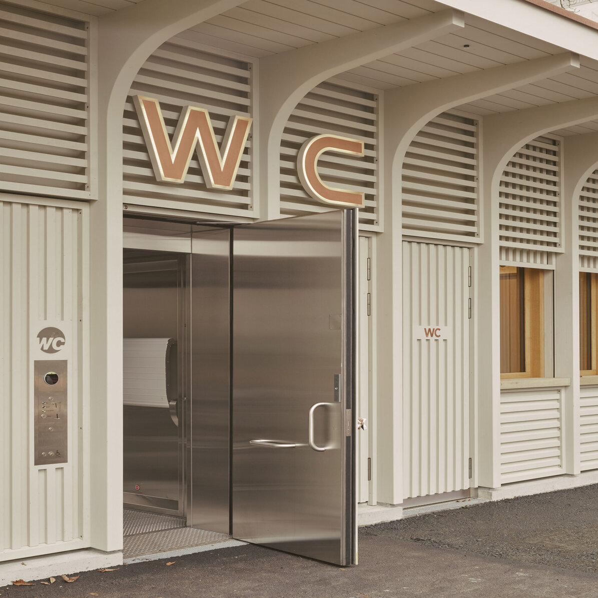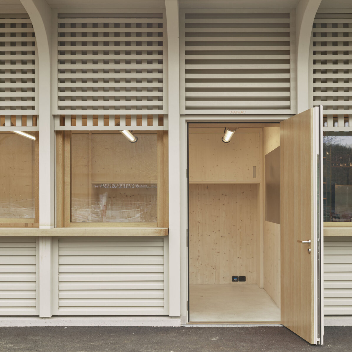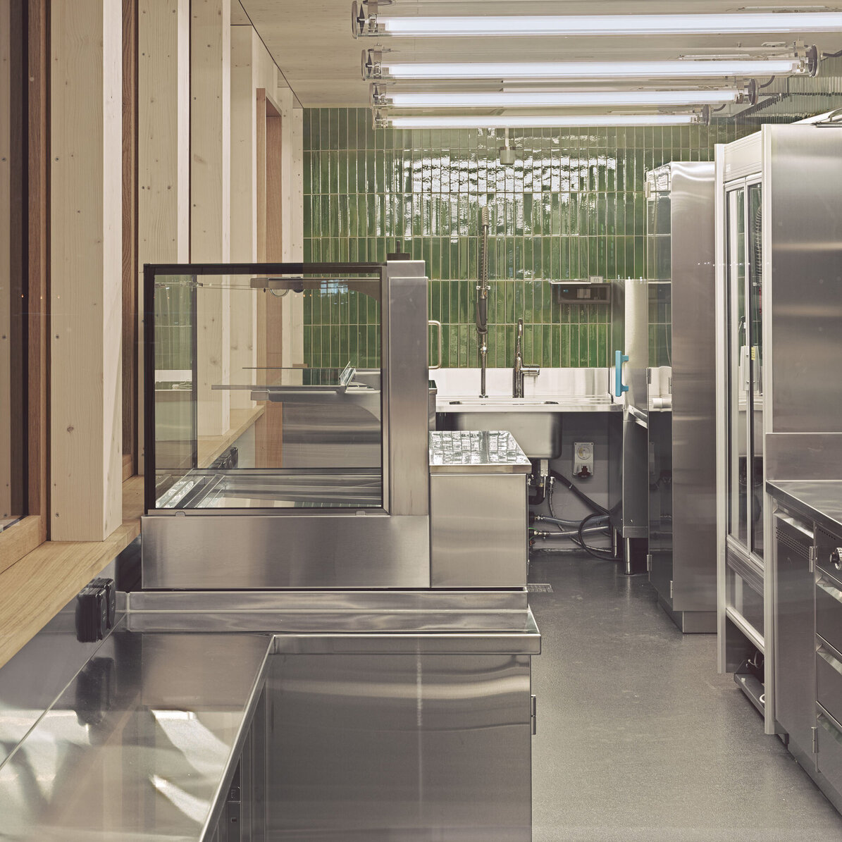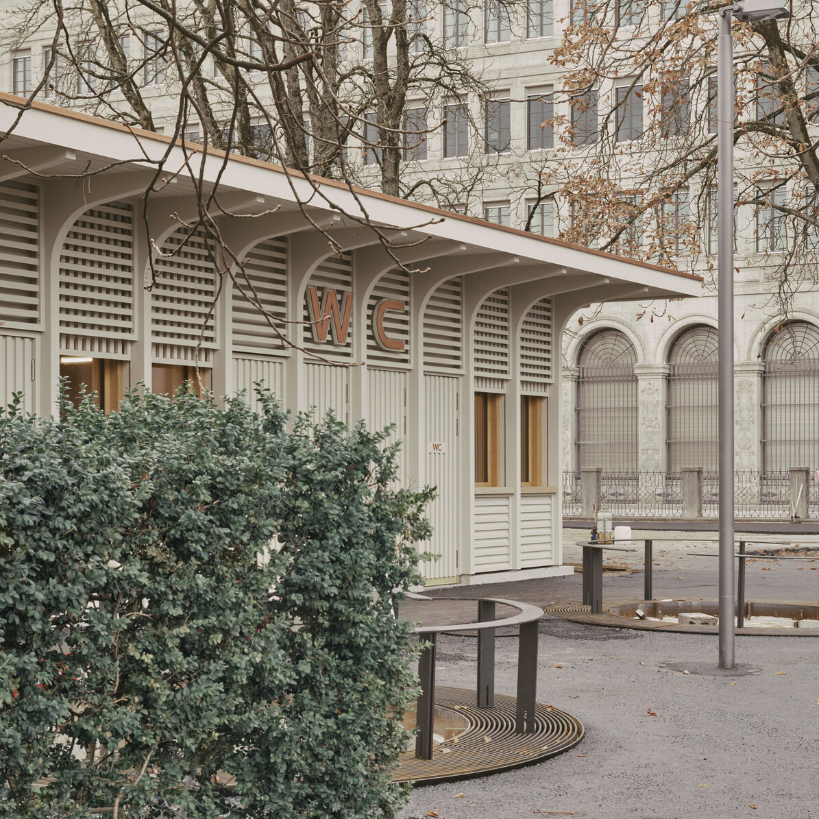 Der Kiosk wurde im Rahmen der Instandstellung der Stadthausanlage durch ein modernes Gebäude ersetzt. Der Neubau vereint verschiedene Nutzungen unter einem Dach. Der kompakte, eingeschossige Holzbau mit Untergeschoss enthält neben der Gast-ronomiefläche zwei Schalter der Marktpolizei, zwei Züri-WCs, Gäste-WCs sowie Haustechnik und eine Trafostation. Das Untergeschoss wurde in konventio-neller Massivbauweise mit Holz-Innenwänden reali-siert. Das Erdgeschoss und das Flachdach wurden als Holzbaukonstruktion erstellt. Die Holzkonstruktion liegt auf einem umlaufenden Sockel aus Sichtbeton auf. Das Vordach wurde so konzipiert, dass es von den auskragenden Fassadenstützen getragen wird. Die nicht tragenden Innenwände und die Aussen-wand wurde in Holzrahmenbauweise erstellt. Die Fassadenbekleidung zwischen den Fassadenstützen besteht aus einer horizontalen Holzlattung im Brüs-tungs- und Sturzbereich und einer vertikalen Holzlat-tung vor der Fensterebene. Die Fassade wurde mit einem deckenden, diffusionsoffenen Anstrich ge-schützt. Um spätere Austausche oder Rückbauten zu ermöglichen, wurde auf die Trennbarkeit der jeweili-gen Bauteile geachtet.