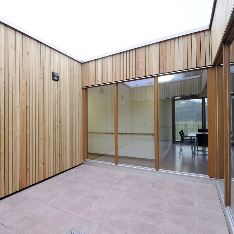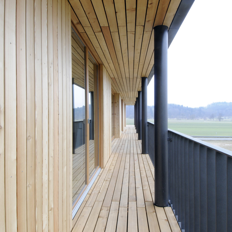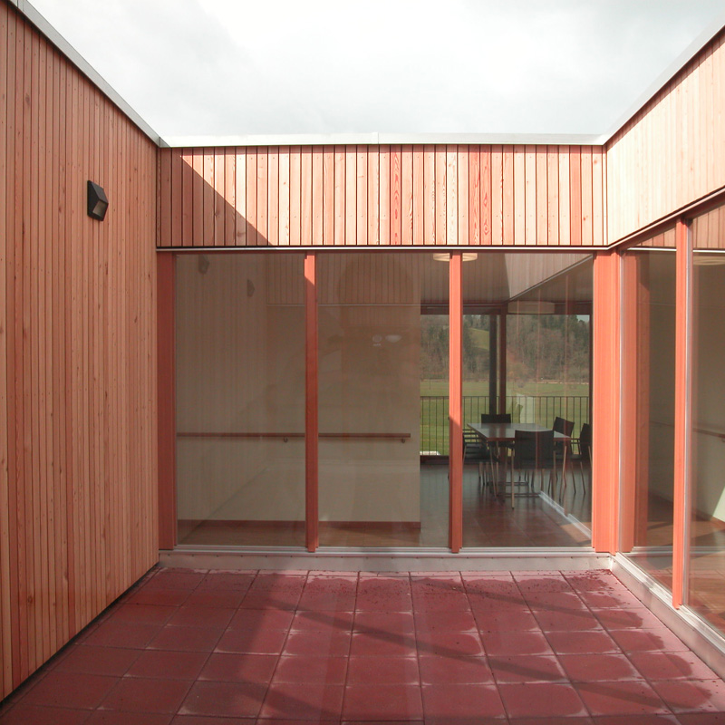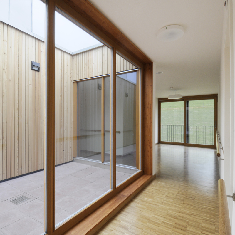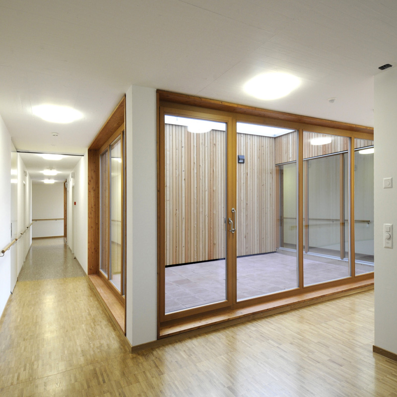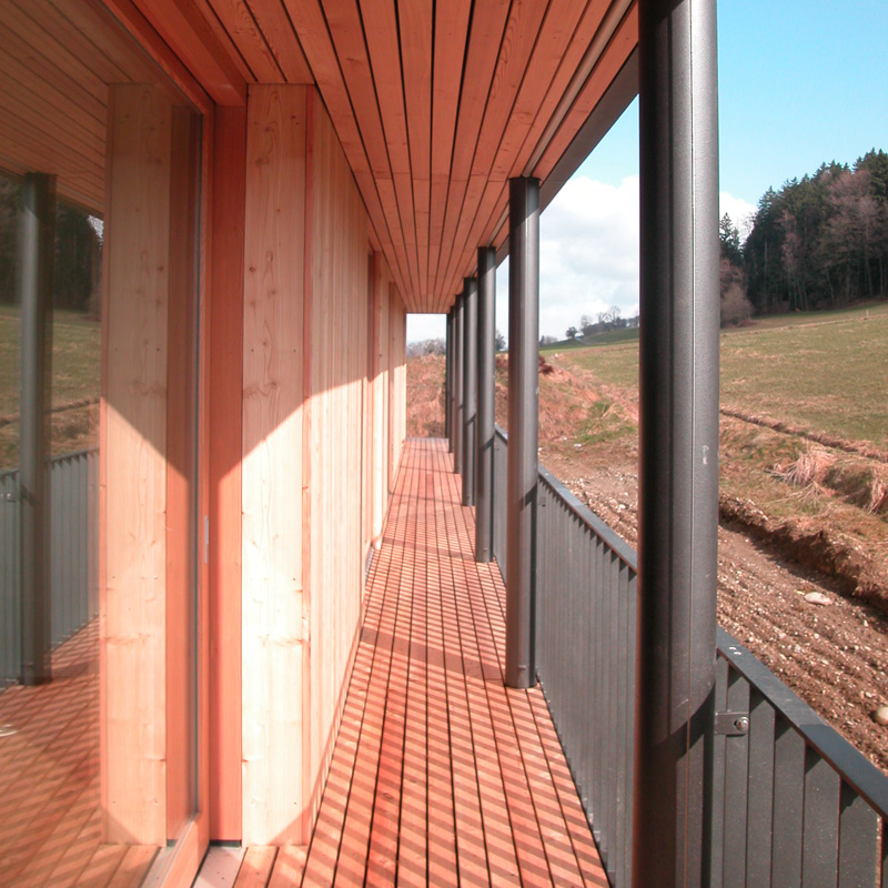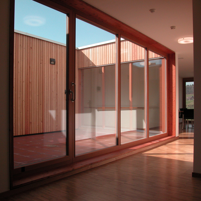Der Neubau des Wohnheimes Brunnmatt ist ein dreigeschossiger Komplex in Stahlbetonbauweise. Bei der Konstruktion handelt es sich um einen Skelettbau, da die Flexibilität einen hohen Stellenwert einnimmt. Die Fassadenelemente werden in ausgedämmten Holzrahmenbauweise konzipiert. Weiter gehören sämtliche Fassaden, Holzroste sowie Untersichten in die Holzbauleistungen. Das Gebäude wurde im Standard Minergie erstellt. Um die Luftdichtigkeit zu prüfen, wurde abschliessend eine erfolgreiche Dichtigkeitsmessung durchgeführt. Damit eine gute Raumluftqualität gewährleistet werden kann, ist ein besonderes Augenmerk auf die Formaldehydemission der einzelnen Baustoffe gelegt. Die Fassade besteht aus einer sichtbar befestigten Holzschalung aus Lärchenholz. Die vertikal angeordneten Bretter weisen Fugen auf und sind auf einer schwarz eingefärbten Hinterlüftungslattung befestigt. Die Fassadenbahn ist diffusionsoffen und schützt die Wärmedämmung vor dem Auskühlungseffekt infolge Windes. Die Innenbeplankung besteht aus einer gestrichenen und verputzten Gipskartonschicht. Die Oberfläche des Bodens wurde als versiegeltes Parkett aus Eichenholz realisiert. Der Bodenrost sowie die Deckenuntersicht auf den Laubengängen bestehen aus Douglasienbretter.