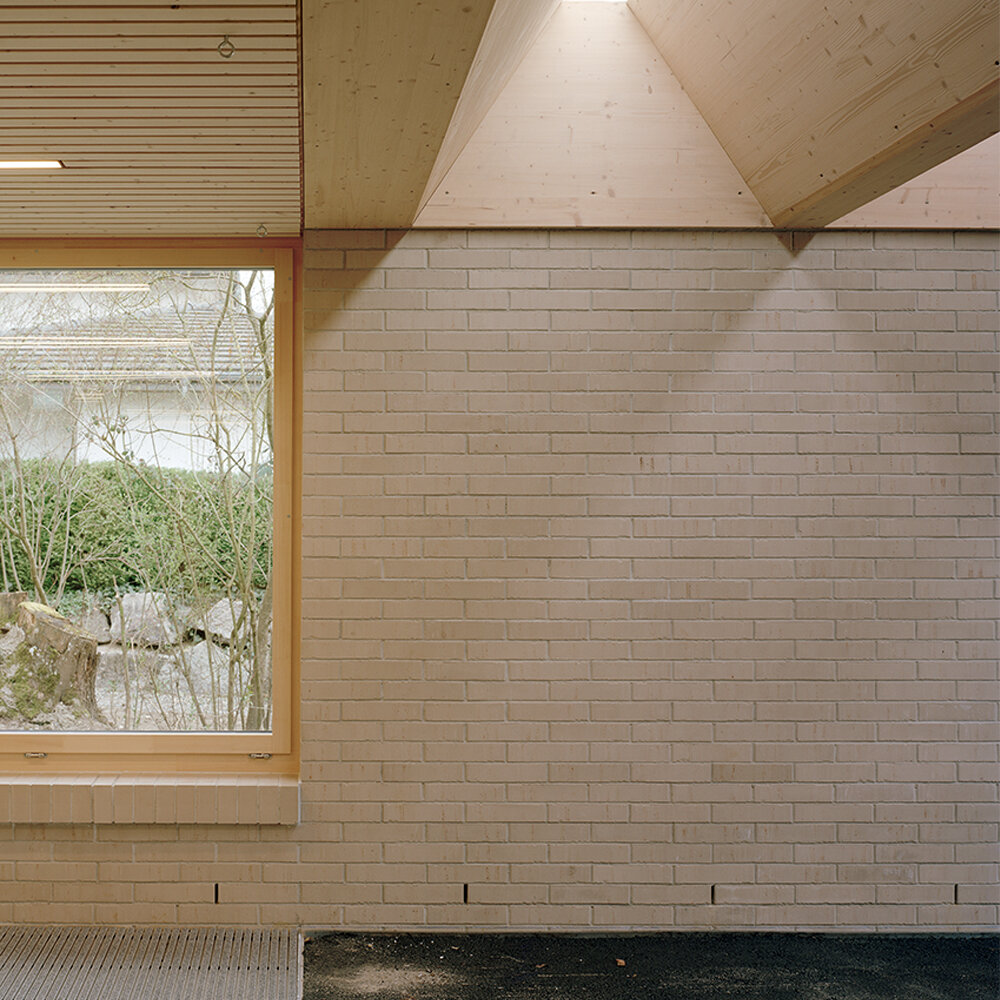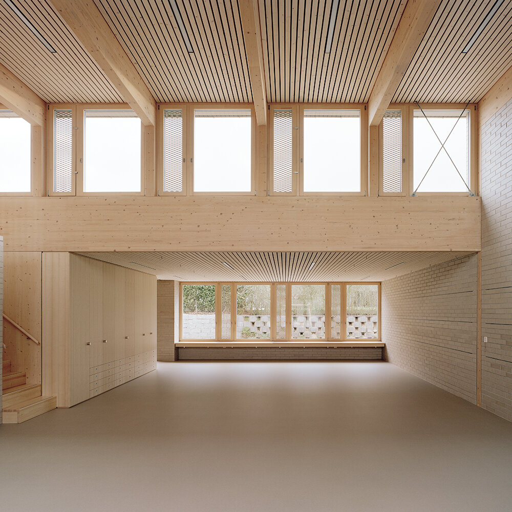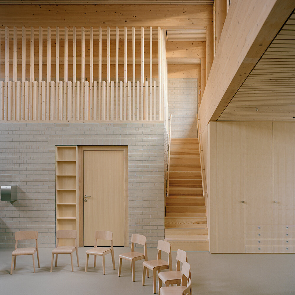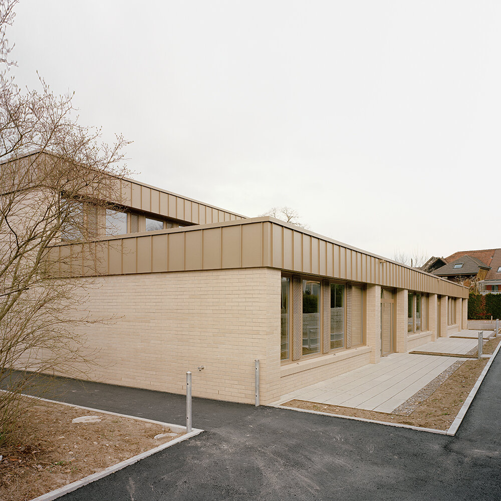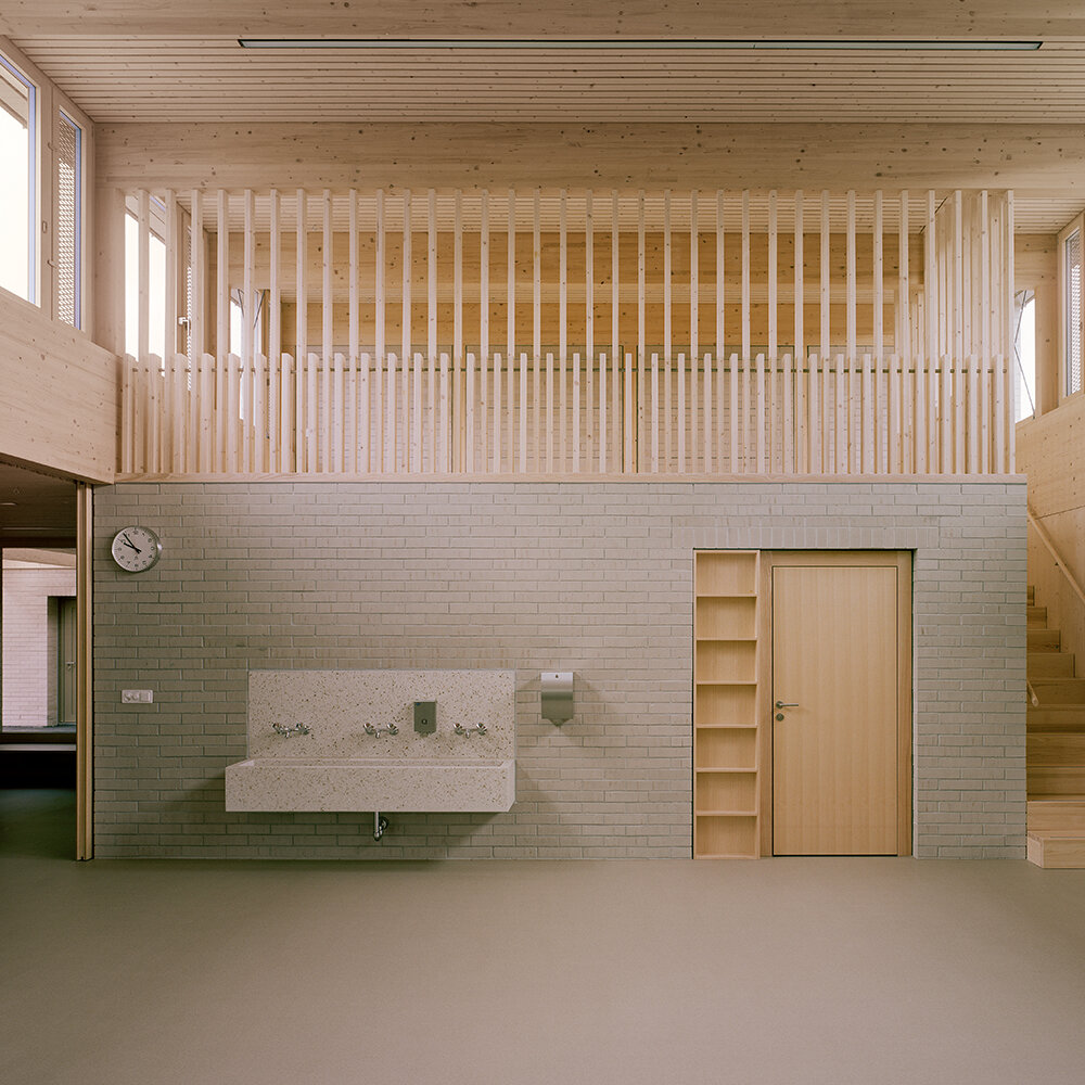 Der Ersatzneubau umfasst drei Kindergarteneinheiten und ersetzt die bestehenden Kindergärten aus den Jahren 1963 und 1968. Die drei Einheiten mit gleichem Grundriss sind eingeschossig und verfügen über eine Galerie. Das extensiv begrünte Dach wurde als Hohlkastenelement vorfabriziert. Für die Galeriedecke kam eine Rippenplatte zum Einsatz. Das Dach über den gedeckten Aussenzimmern besteht aus v-förmigen Holzelementen. Die eingebauten feinen Glasstreifen sorgen für ausreichend Tageslicht in den gedeckten Räumen. Über den Klassenräumen wird das Flachdach mit Brettschichtholzträgern und darüberliegender Brettsperrholzplatte ausgebildet. Die Aussenwände bestehen aus zweischaligen Klinkersteinkonstruktionen mit Dämmung im Zwischenbereich. Neben dem sichtbaren Klinker-Mauerwerk werden die Wandoberflächen der Innenwände in den Gruppenräumen mit Dreischichtplatten und in den Nasszellen resp. Materialräumen mit Gips materialisiert. Die abgehängte offene Akustikschalung sorgt für eine gute Raumakustik. Haustechnische Installationen werden im abgehängten Bereich unter der Galerie geführt.
