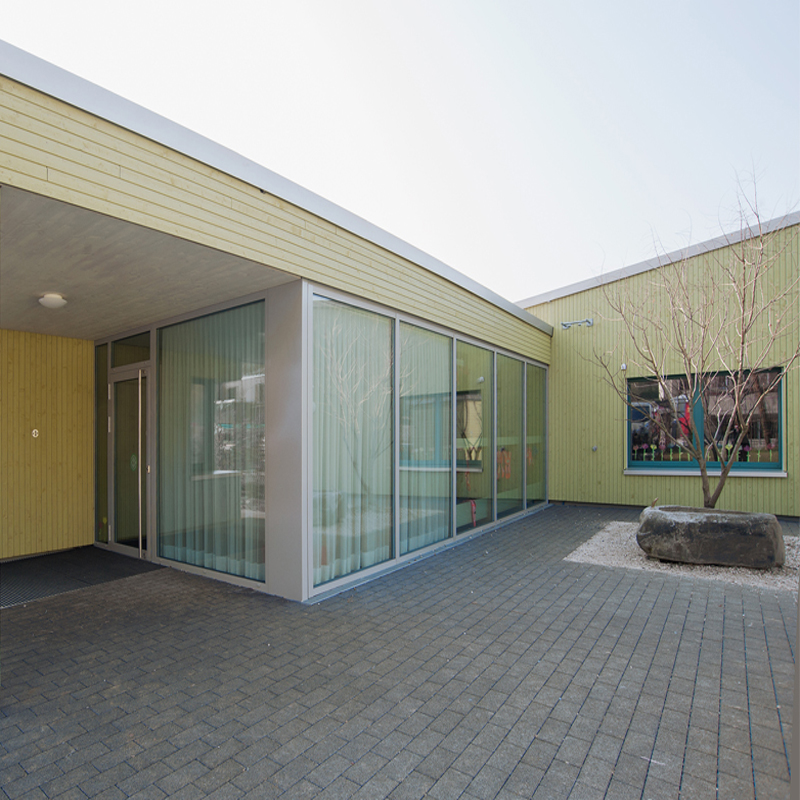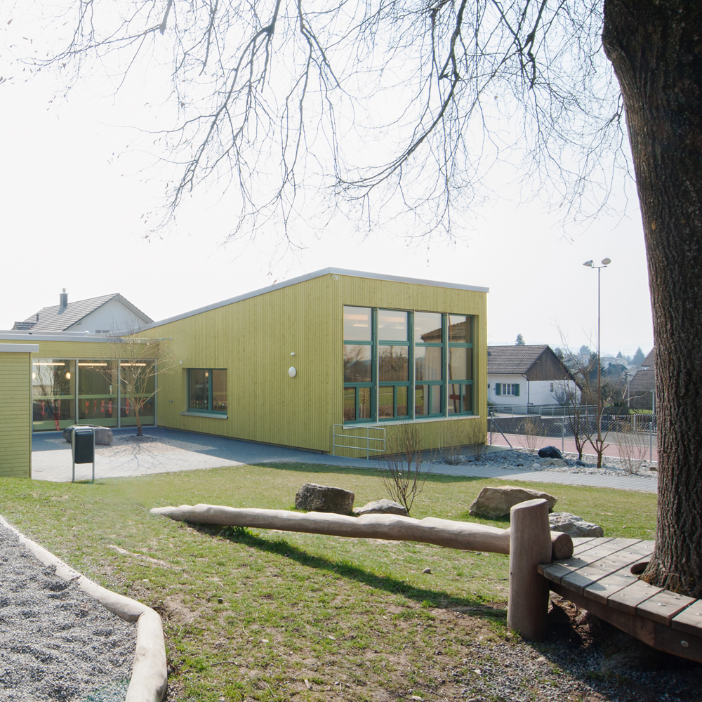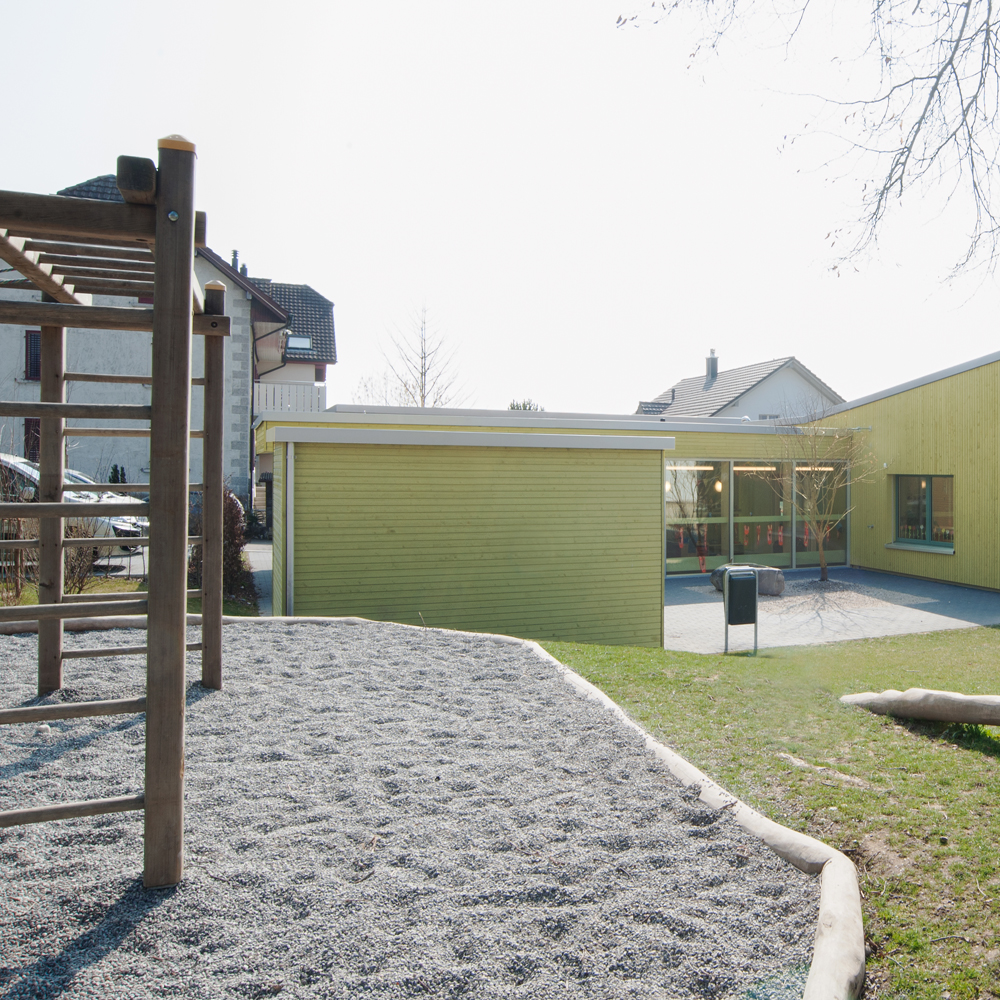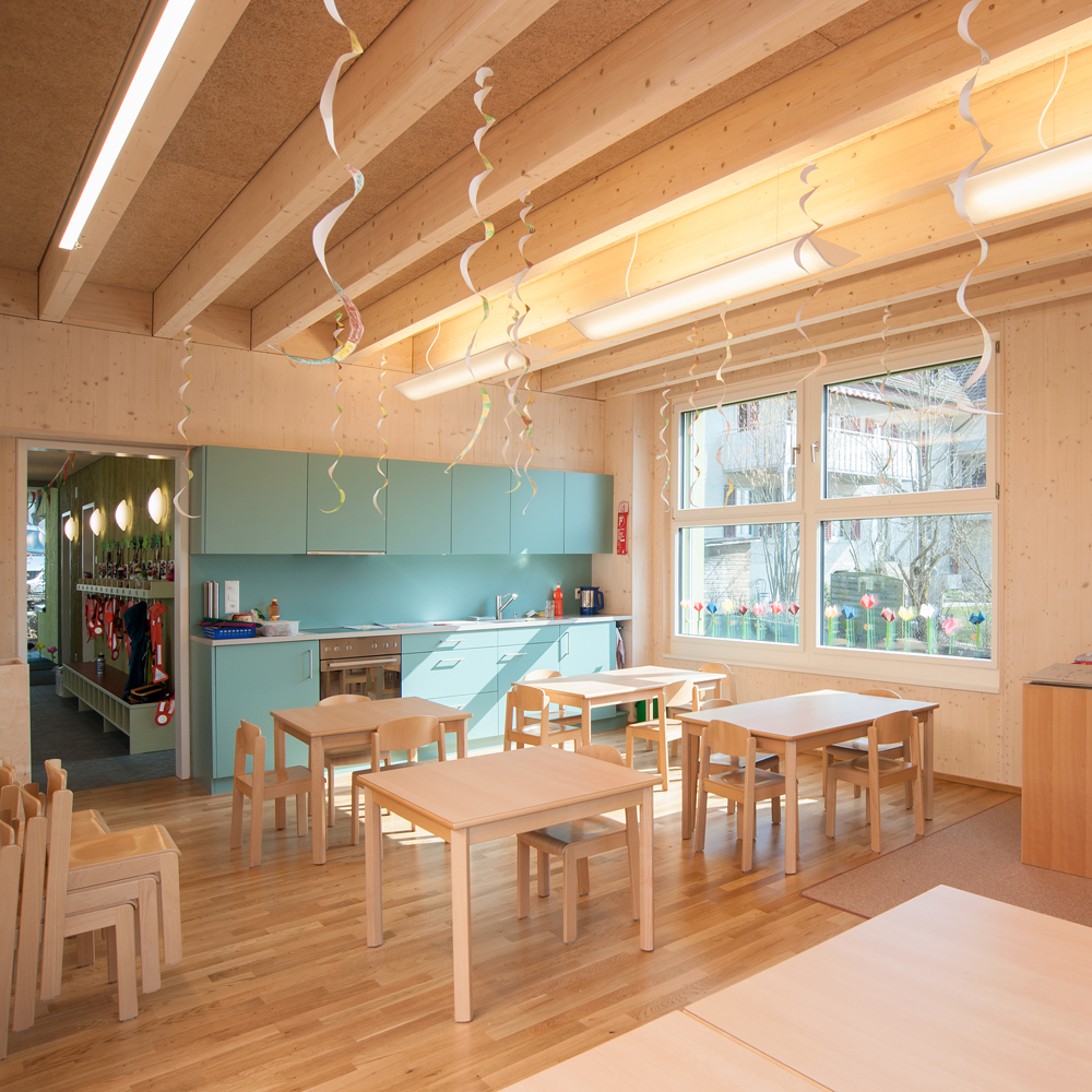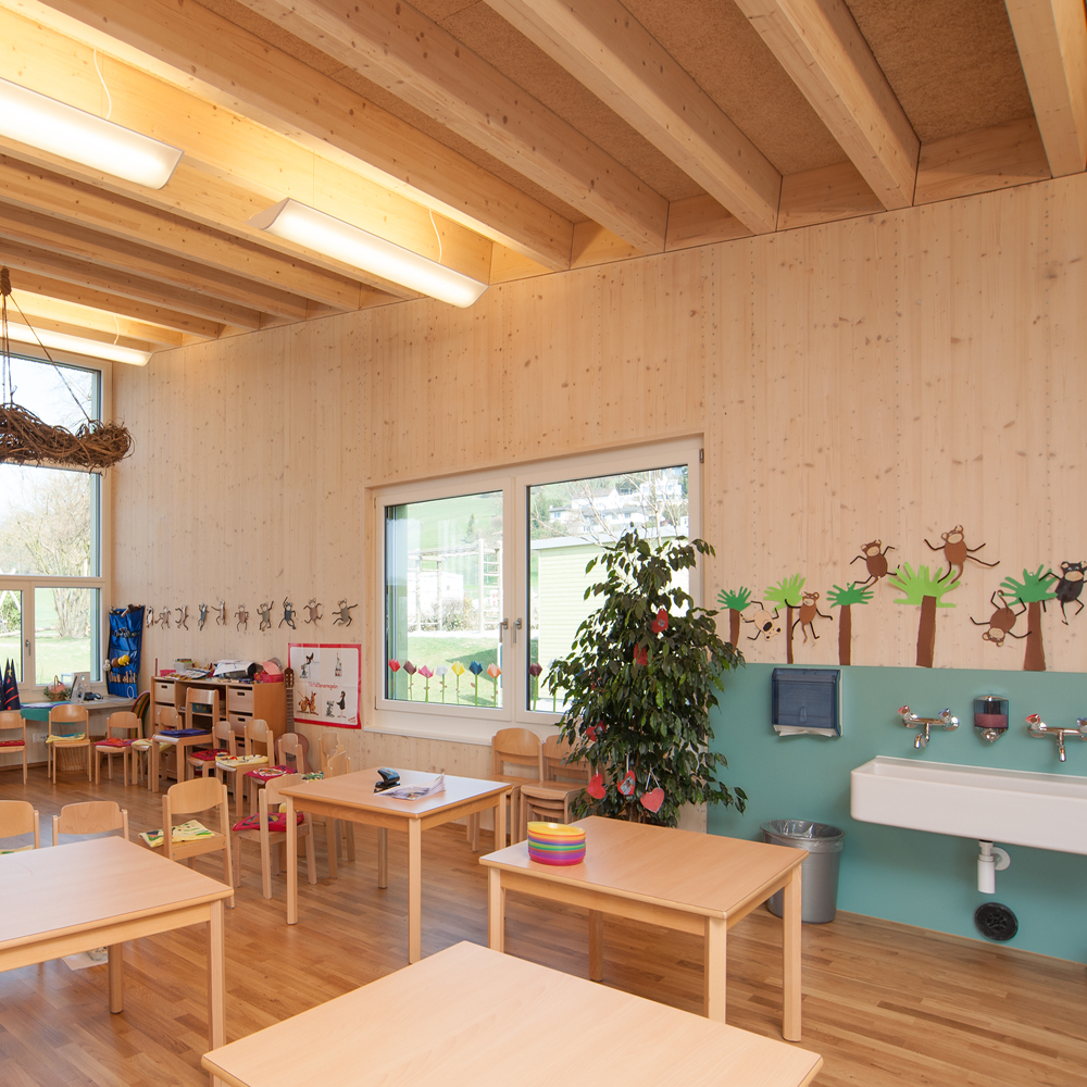Der Kindergarten weist einen L-förmigen Grundriss auf und bietet Platz für eine Kindergarteneinheit. Im Kindergarten werden Gruppenräume, Eingangsbereich mit Garderobe, Nasszellen, Technikraum und Hauptraum untergebracht. In einem zusätzlich erstellten Schopf auf dem Pausenplatzareal, können Aussenmaterial und Spielsachen verstaut werden. Das Gebäude ist ab der Bodenplatte ein kompletter Holzbau. Aussenund Innenwände wurden als gedämmte Holzrahmenkonstruktionen ausgebildet. Das Dach wurde als überdämmte Rippenplatte erstellt. Die Stabilisierung wird durch Wand- und Dachscheiben gewährleistet, welche die Last infolge Wind und Erdbeben abtragen. Von aussen ist ein markanter Knick im Hauptgebäudeteil erkennbar. Das Flachdach wird extensiv begrünt und die schräge Dachseite mit Photovoltaikpanels ausgestattet. Grosse Fensterflächen sorgen für Behaglichkeit und belichten die Aufenthaltsräume natürlich. Die Oberflächen an den Wandinnenseiten werden durch Holz bestimmt. Innen- und Aussenwände werden sichtbar geschraubt. Die Dachsparren und die darüber liegende Dreischichtplatte bleiben roh. Die Fassade ist teils vertikal und teils horizontal ausgerichtet und mit einem Kreuzrost hinterlüftet. Die Holzschalung ist sichtbar befestigt und grün eingefärbt.