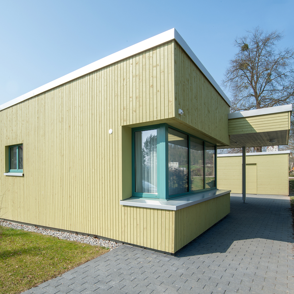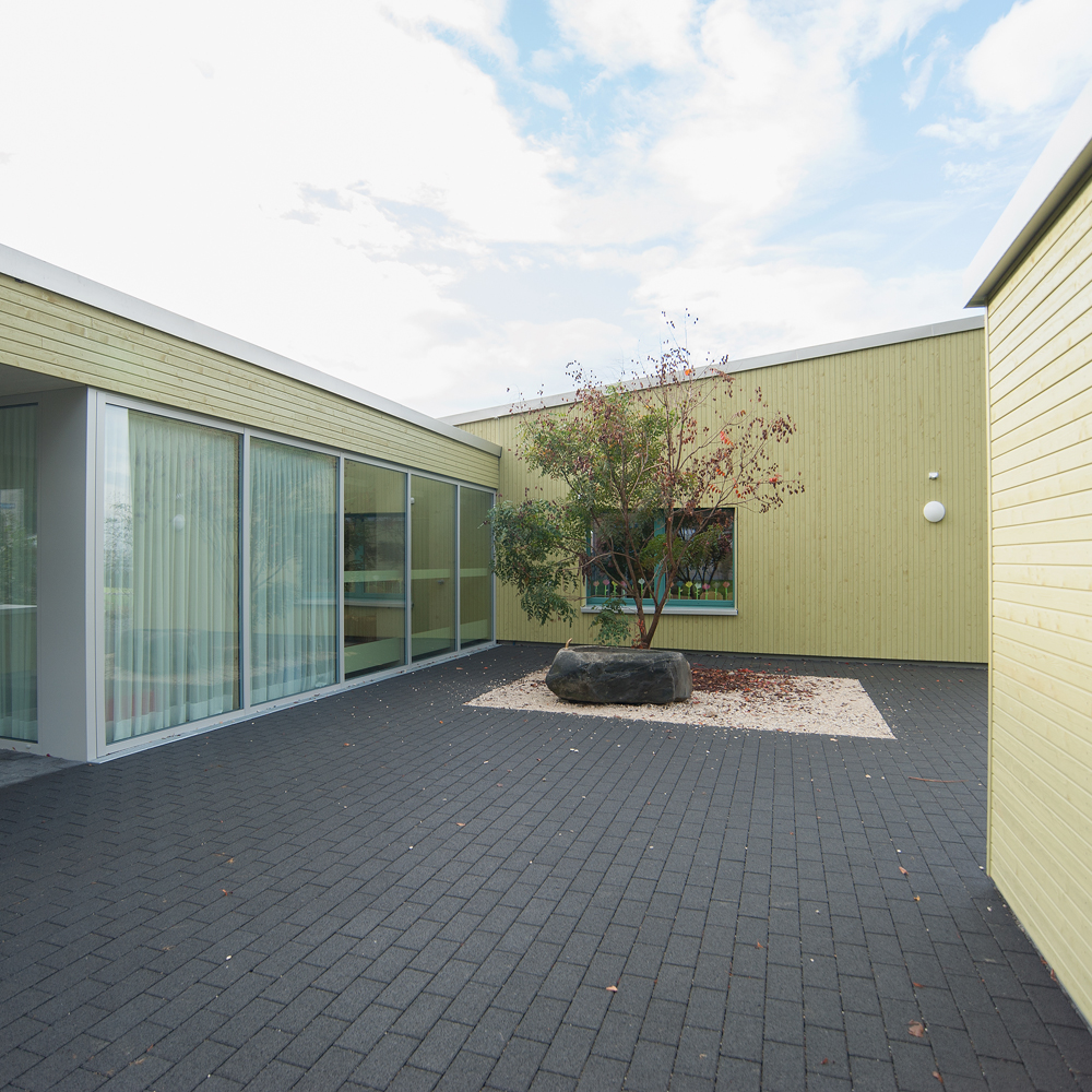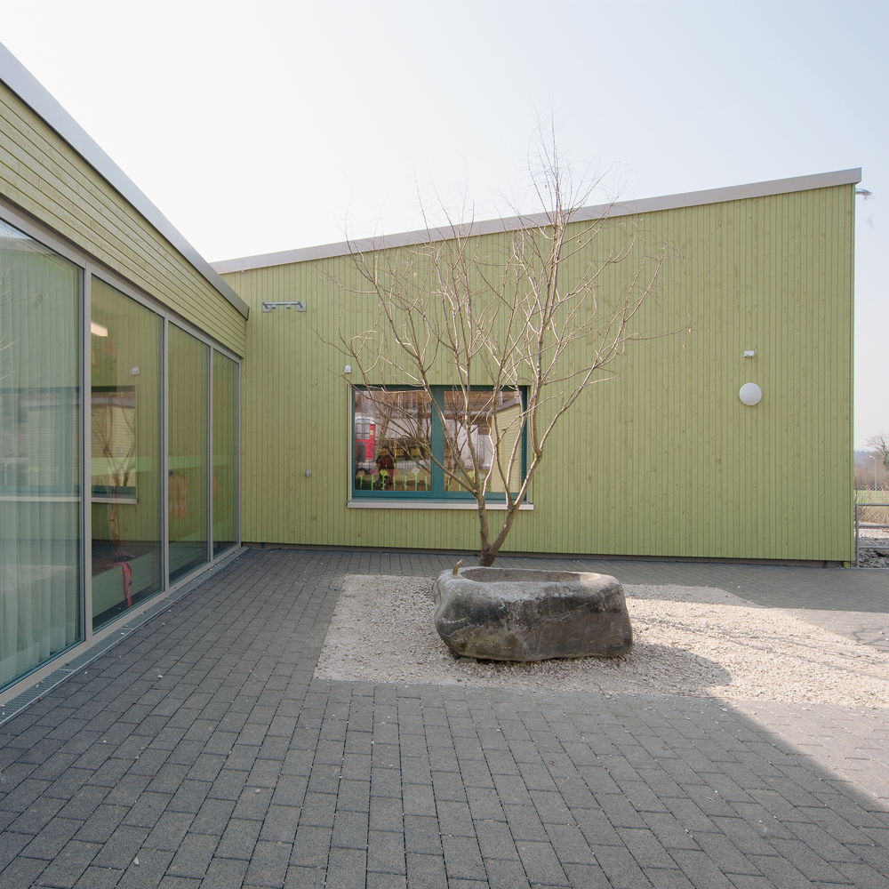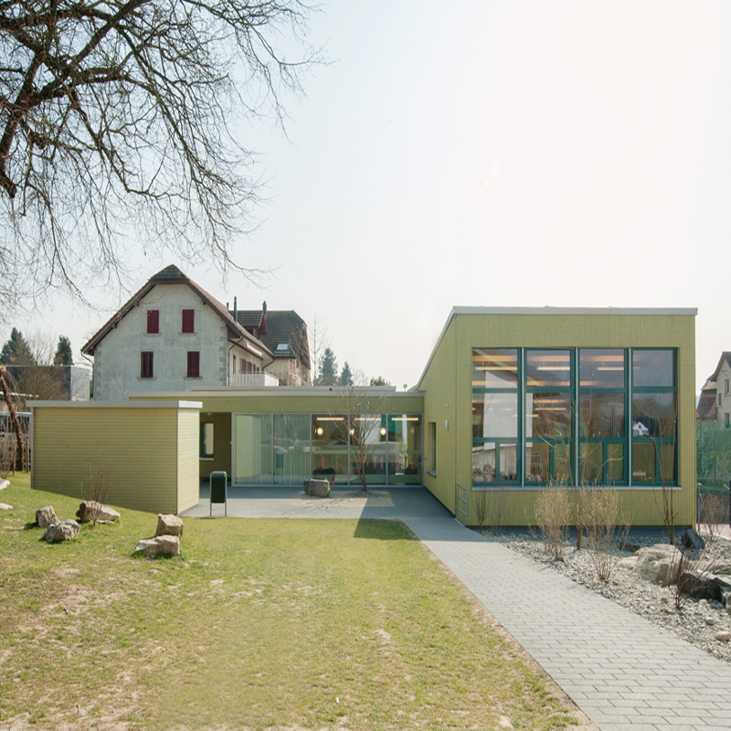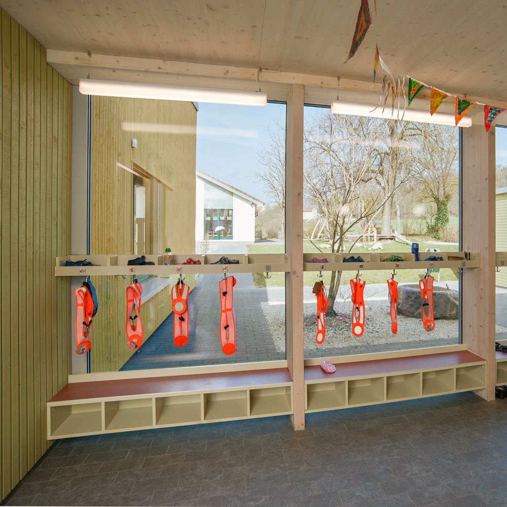 Der Kindergarten weist einen L-förmigen Grundriss auf und bietet Platz für eine Kindergarteneinheit. Im Kindergarten werden Gruppenräume, Eingangsbereich mit Garderobe, Nasszellen, Technikraum und Hauptraum untergebracht. In einem zusätzlich erstellten Schopf auf dem Pausenplatzareal, können Aussenmaterial und Spielsachen verstaut werden. Das Gebäude ist ab der Bodenplatte ein kompletter Holzbau. Aussenund Innenwände wurden als gedämmte Holzrahmenkonstruktionen ausgebildet. Das Dach wurde als überdämmte Rippenplatte erstellt. Die Stabilisierung wird durch Wand- und Dachscheiben gewährleistet, welche die Last infolge Wind und Erdbeben abtragen. Von aussen ist ein markanter Knick im Hauptgebäudeteil erkennbar. Das Flachdach wird extensiv begrünt und die schräge Dachseite mit Photovoltaikpanels ausgestattet. Grosse Fensterflächen sorgen für Behaglichkeit und belichten die Aufenthaltsräume natürlich. Die Oberflächen an den Wandinnenseiten werden durch Holz bestimmt. Innen- und Aussenwände werden sichtbar geschraubt. Die Dachsparren und die darüber liegende Dreischichtplatte bleiben roh. Die Fassade ist teils vertikal und teils horizontal ausgerichtet und mit einem Kreuzrost hinterlüftet. Die Holzschalung ist sichtbar befestigt und grün eingefärbt.