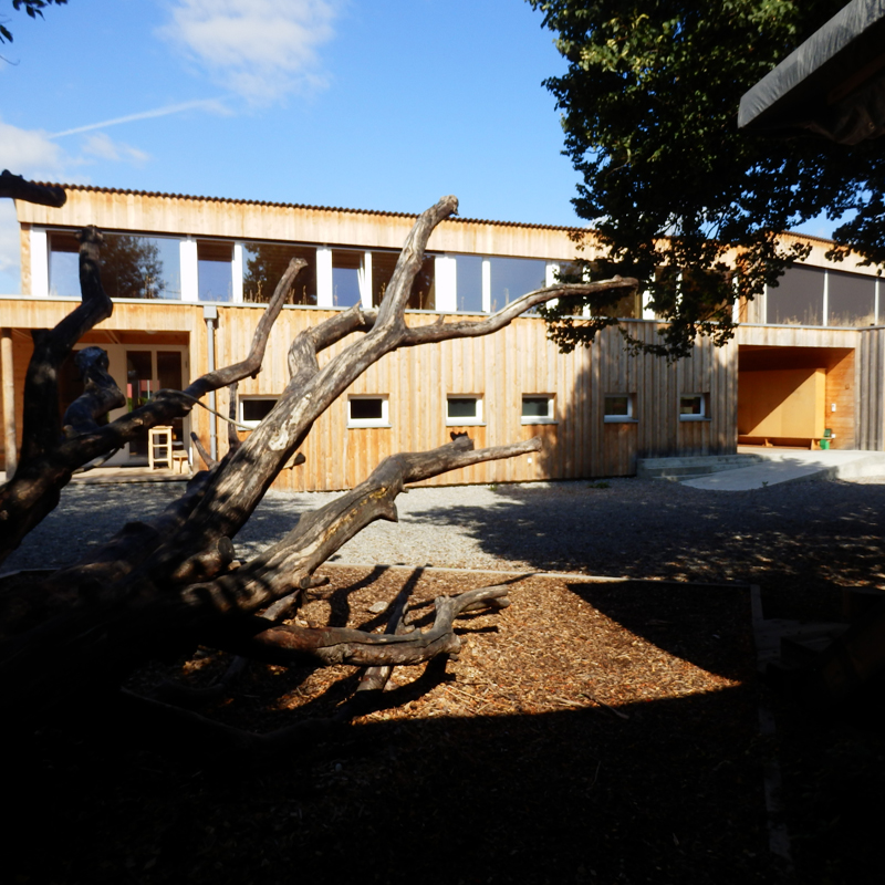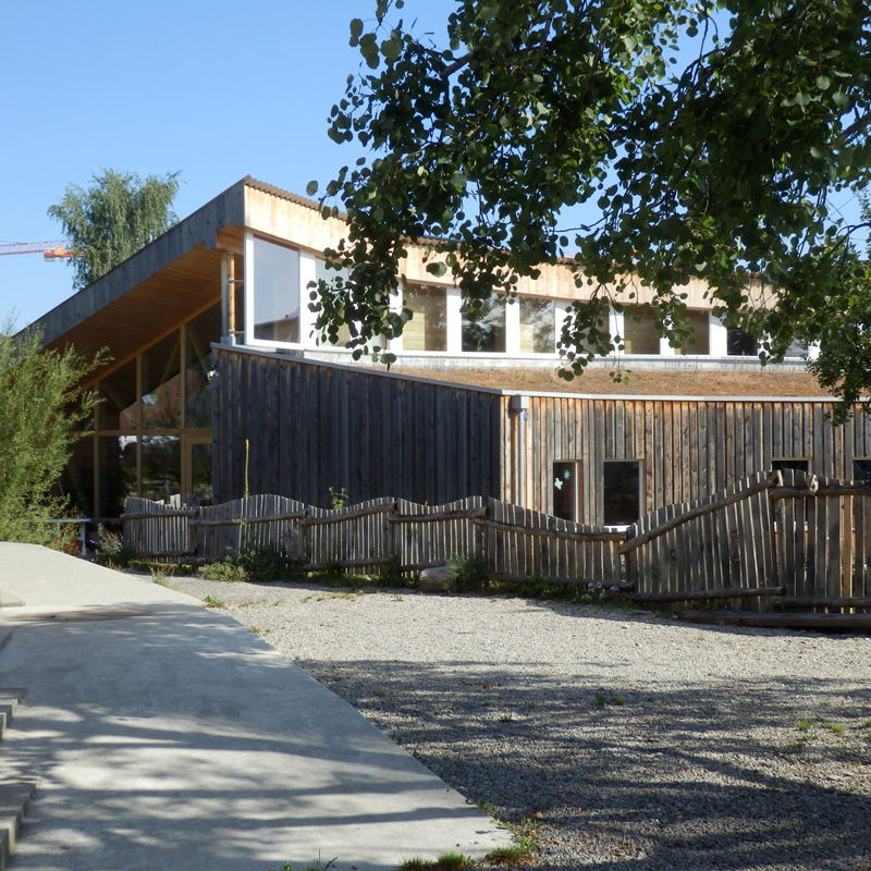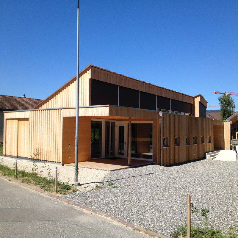 Die Rudolf Steiner Schule in Schafisheim besteht aus zwei eingeschossigen Gebäuden, welche in zwei Etappen realisiert wurden. In der ersten Etappe entstand die Kinderkrippe mit dem Kindergarten, in der zweiten Etappe wurde das Primarschulhaus erstellt. Während die Aussen- und Innenwände als ausgedämmte Ständerkonstruktion geplant wurden, liegen das Dach als Rippenelement orthogonal auf den Trägern. Die Träger weisen eine Verjüngung auf und leiten die Last via Stützen ans Fundament weiter. Für die Stabilisierung sind Wände, Geschossdecken und Dachelemente mit einer Diagonalschalung bekleidet worden.