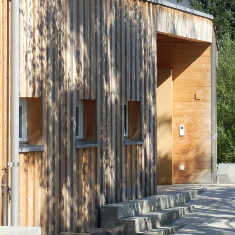 Die Fassaden bestehen aus einer rohen, vertikal angeordneten Bretterschalung aus Fichte/Tanne. Eine Hinterlüftungsebene sorgt für die Auskühlung als sommerlicher Wärmeschutz. Die Ständerkonstruktion wurde innen mit einer Holzschalung mit Nut und Kamm bekleidet. Als Deckenuntersicht sind offene, konisch gehobelte Schalungsriemen verbaut.