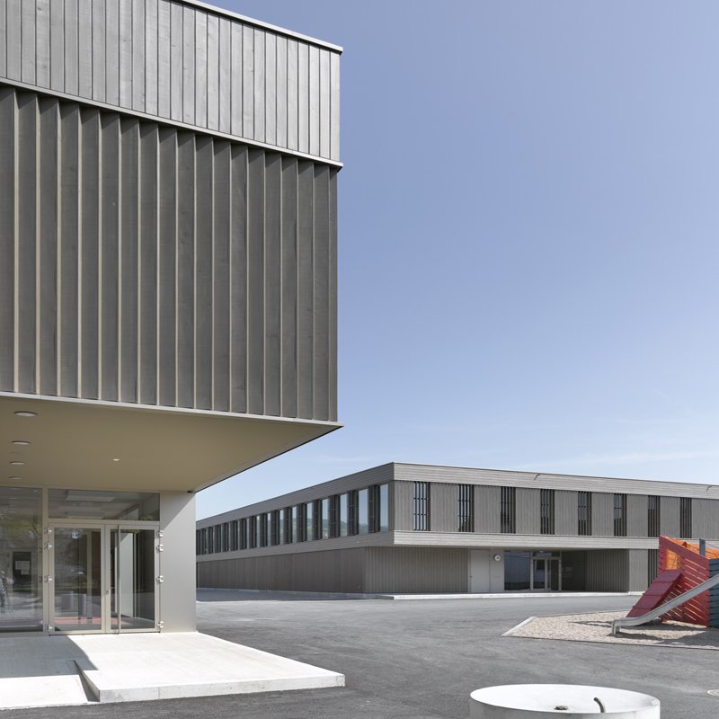 Die Erweiterung der bestehenden Pavillonbauten zur vollständigen Primarschulanlage erfolgte durch zwei voneinander unabhängige Baukörper: eine Einfachturnhalle und ein zweigeschossiges Schulhaus.