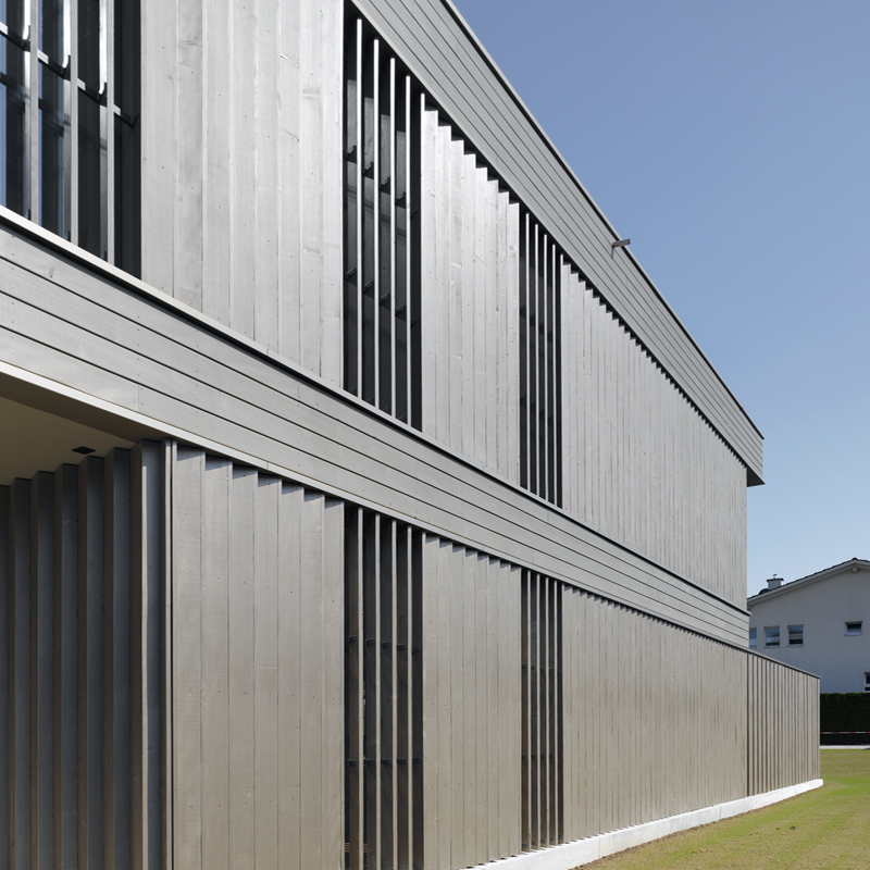 Durch die Metallpigmentierung des Holzanstrichs erhält die Aussenhaut einen edlen Glanz, die den gemeinhin mit Holz assoziierten Eindruck verfremdet und die Langlebigkeit der Holzverschalung sichert.