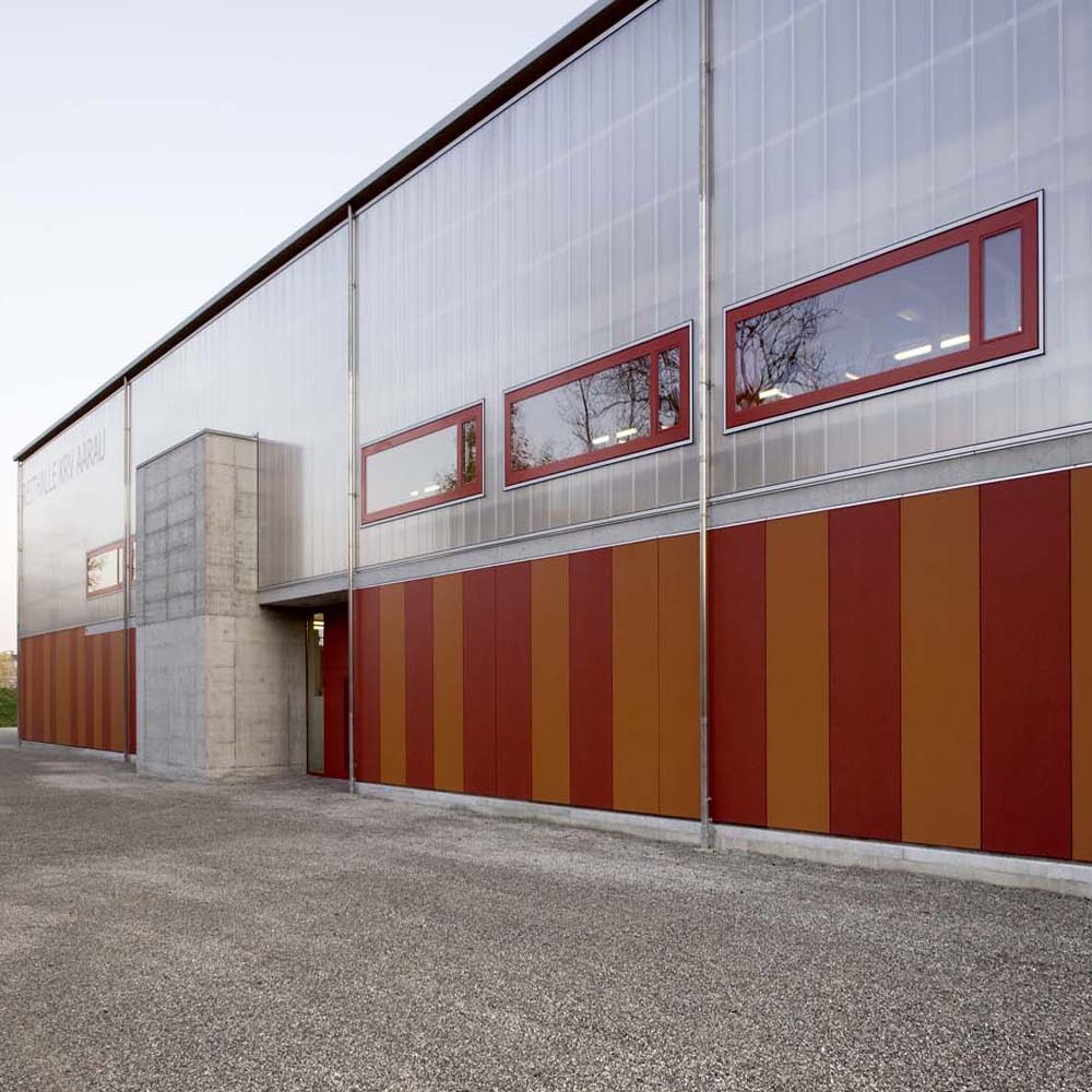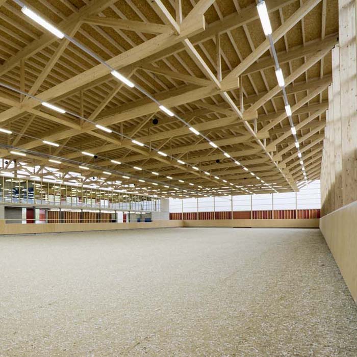 Die gesamten Aussenmasse des eingeschossigen Neubaus der Reithalle betragen ca. 81.40 x 32.60m x 10.40m (Länge x Breite x Höhe). Längsseitig auf der Nordseite ist ein zweigeschossiger Einbau integriert. Dort sind die Restauration, die Treppenhäuser, ein Juryraum sowie Räume der Technik und des Gebäudeunterhalts untergebracht. Der Einbau wurde in Stahlbeton und Holzbauweise erstellt. Die Halle steht südseitig und bei den Giebelwänden auf einem Betonriegel; nordseitig auf dem Einbau in Stahlbeton. Der nordseitige Einbau ist teilweise in Stahlbeton-Bauweise ausgeführt. Dort werden die Horizontalkräfte in Querrichtung der Halle, sowie die Längskräfte der Nordseite abgegeben. Südseitig werden die Längskräfte mittels Zugstangen in den Betonriegel abgegeben. Die Dachkonstruktion und die Aussenwände sind in Holzbauweise erstellt. Die Aussenwände wurden im unteren Bereich (bis ca. auf die Höhe von 3.50m) mit Formboard-Platten einseitig beplankt. Diese sind von innen und aussen sichtbar. Ab der Höhe von ca. 3.50m wurden Polykarbonat-Platten auf die Holzunterkonstruktion geschraubt. Über die Spannweite der Halle von 32.00m sind 15 Fachwerke im „BSB-System“ gespannt (Systemhöhe 2.70m bis 2.40m). Rippendecken bilden das Sekundärtragwerk welches auf den Fachwerken aufgelegt ist. Die Halle ist mit Ausnahme der Restaurationsräume ungedämmt.