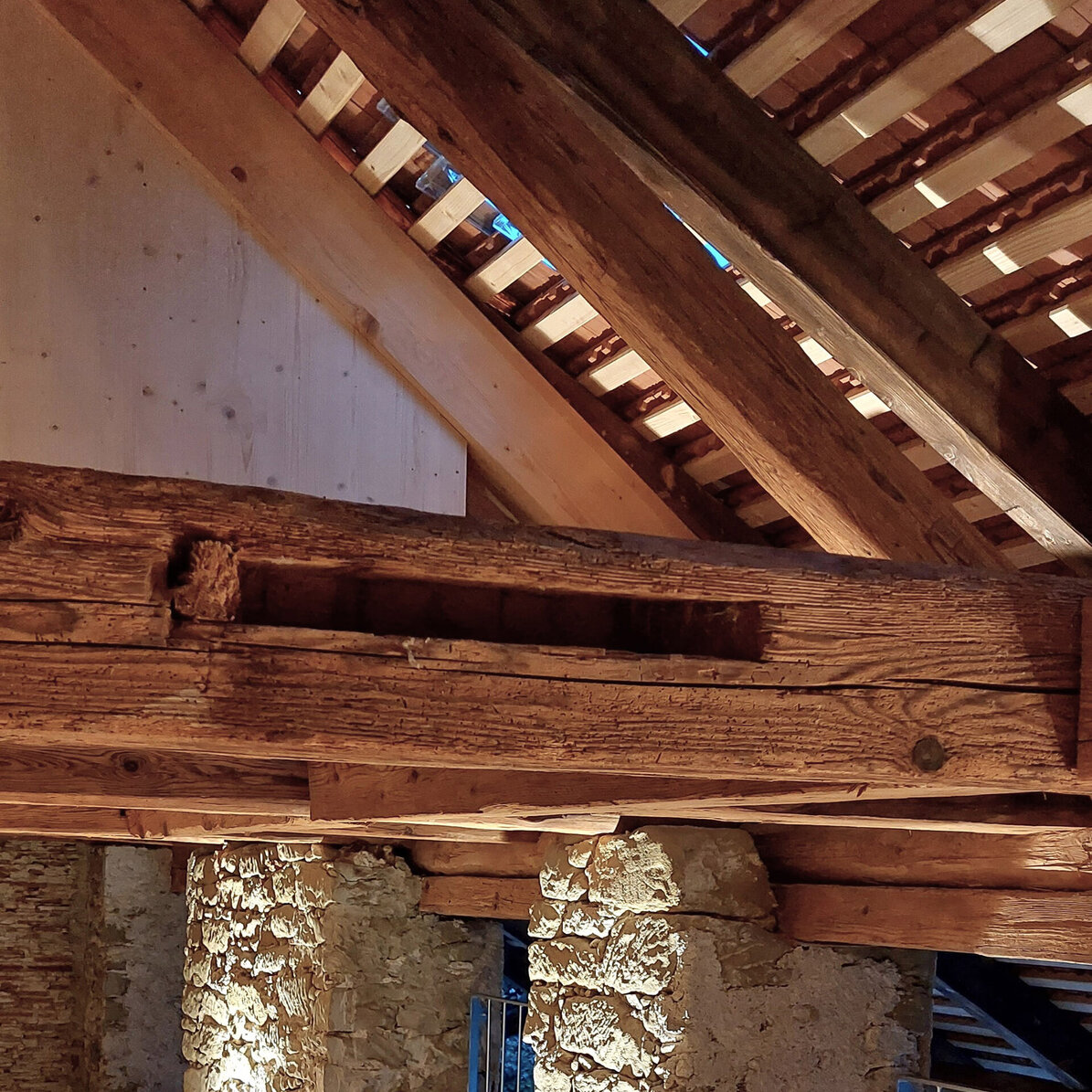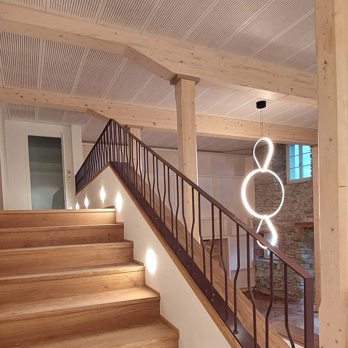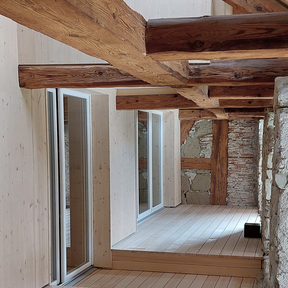 Das Altstadthaus ist ein dreigeschossiger Altbau ohne Unterkellerung. Das Ökonomiegebäude aus dem 19. Jahrhundert wurde direkt an die ehemalige unter Denkmalschutz stehende Stadtmauer angebaut. Das Hauptbauwerk ist mit dem damals üblichen Mischmauerwerk erbaut worden. Die Holzkonstruktion war teilweise stark beeinträchtigt und musste, für die neue Nutzung als Wohnhaus, stellenweise erneuert werden. Eine Herausforderung waren die unterdimensionierten Bauteile und teils grossen Spannweiten. Im ersten Obergeschoss erreicht man über die Zuhörer- und Sängergalerie die private «Stube» aus Arvenholz, welche gassenseitig bis unter das Steildach reicht. Von hier aus erschliesst eine Treppe die privaten Schlafräume und das Gästezimmer im Dachgeschoss.