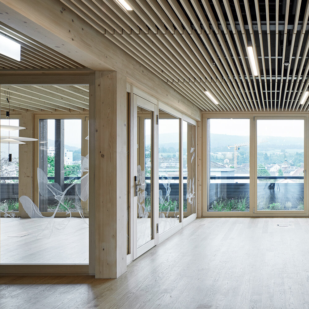 Der neue Hauptsitz der EGK Gesundheitskasse weist ein Untergeschoss, vier Vollgeschosse und ein Attika auf. Im Untergeschoss befinden sich Technikräume und Parking. In den Geschossen über Terrain sind Büroräume der Agentur vorgesehen. Das Untergeschoss und die beiden Treppentürme sind in Massivbauweise, die restlichen Geschosse sind in Holzbauweise erstellt . Das Gebäude wurde als Skelettbau mit sichtbaren Stützen und Unterzügen aus Holz konzipiert. Die Dach- und Deckenelemente bestehen aus Balkenlagen und teils als Rippenplatten. Die Elemente wirken als Einfeldträger und spannen zwischen den Unterzügen. Die Aussenwand besteht aus grossen Fenstern mit vorgefertigten Brüstungselementen. Geschossweise wurde ein Vordach in der Deckenebene montiert. Die Aussteifung wurde von den Dach- beziehungsweise Deckenscheiben und den Erschliessungskerne gewährleistet. Die Fassade besteht aus einer horizontal ausgerichteten Holzschalung. Die sägeraue Holzschalung wurde kesseldruckimprägniert und mit einer Öllasur nachbehandelt. Die inneren Oberflächen an den Aussenwänden wurden mit Dreischichtplatten materialisiert. In der abgehängten Decke zwischen den sichtbaren Balken ist Haustechnik untergebracht.