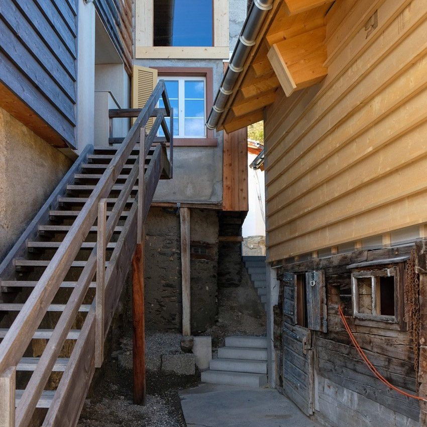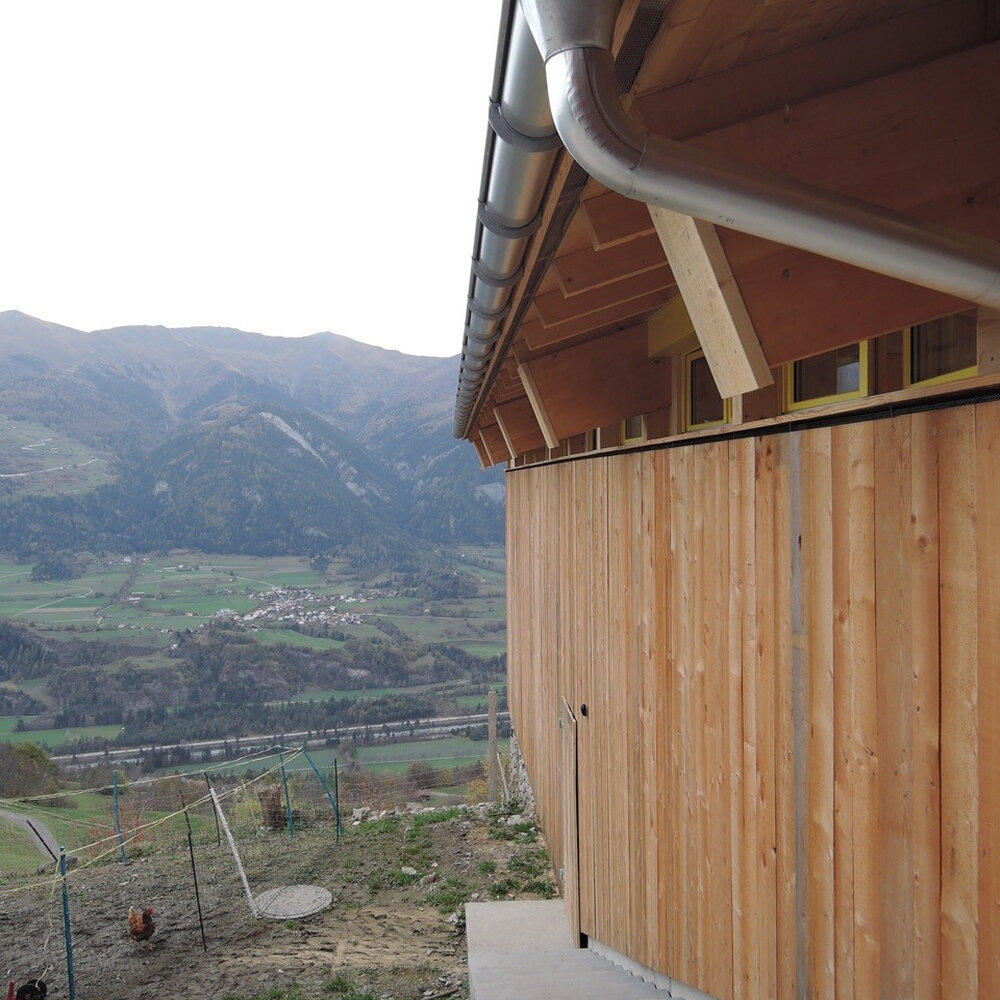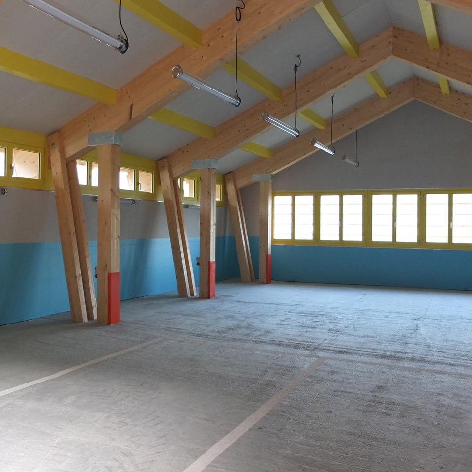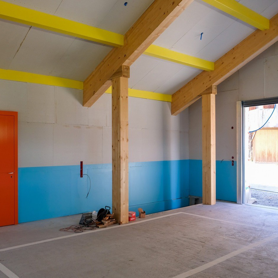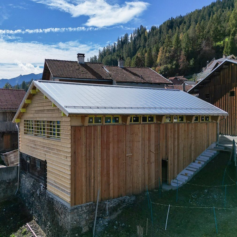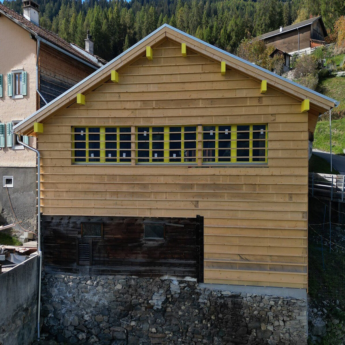 In prominenter Lage am Dorfrand entstand aus einer alten Stallscheune ein Raum für die Dorfgemeinschaft. Der Sockel aus Bruchsteinmauerwerk und der alte Stall in Strickbauweise sollten aus Heimatschutzgründen erhalten bleiben. Das einsturzgefährdete Dach und die alte Rundholzkonstruktion wurden abgebrochen. Innerhalb der Mantellinie entstand ein Ersatzbau in Holzbauweise. Die neue Konstruktion wurde als «Pfahlbau» auf ein Raster von Punktfundamenten innerhalb der bestehenden Struktur gestellt. Das Dach ist stützenfrei über eine Fläche von 8 x 15 m gespannt. Schrägstützen verbinden die beiden Geschosse und machen die Konstruktion im ehemaligen Stallgeschoss erlebbar. Die Binderebenen strukturieren die Fassaden und schaffen im Inneren seitliche Arbeitsnischen. Die Lagerfläche im Untergeschoss ist über eine Innen- und eine Aussentreppe erschlossen. In Anlehnung an die ehemalige Rundholzkonstruktion wurde eine horizontal betonte Rippenschalung in Tanne ausgeführt. Die Wetterseite erhielt ein glattes Regenkleid aus stumpf gestossenen Lärchenbrettern. Ein schmales Oblichtband betont die Flächigkeit der prominenten Fassade am Dorfausgang und hebt das leichte Blechdach vom Volumen ab.